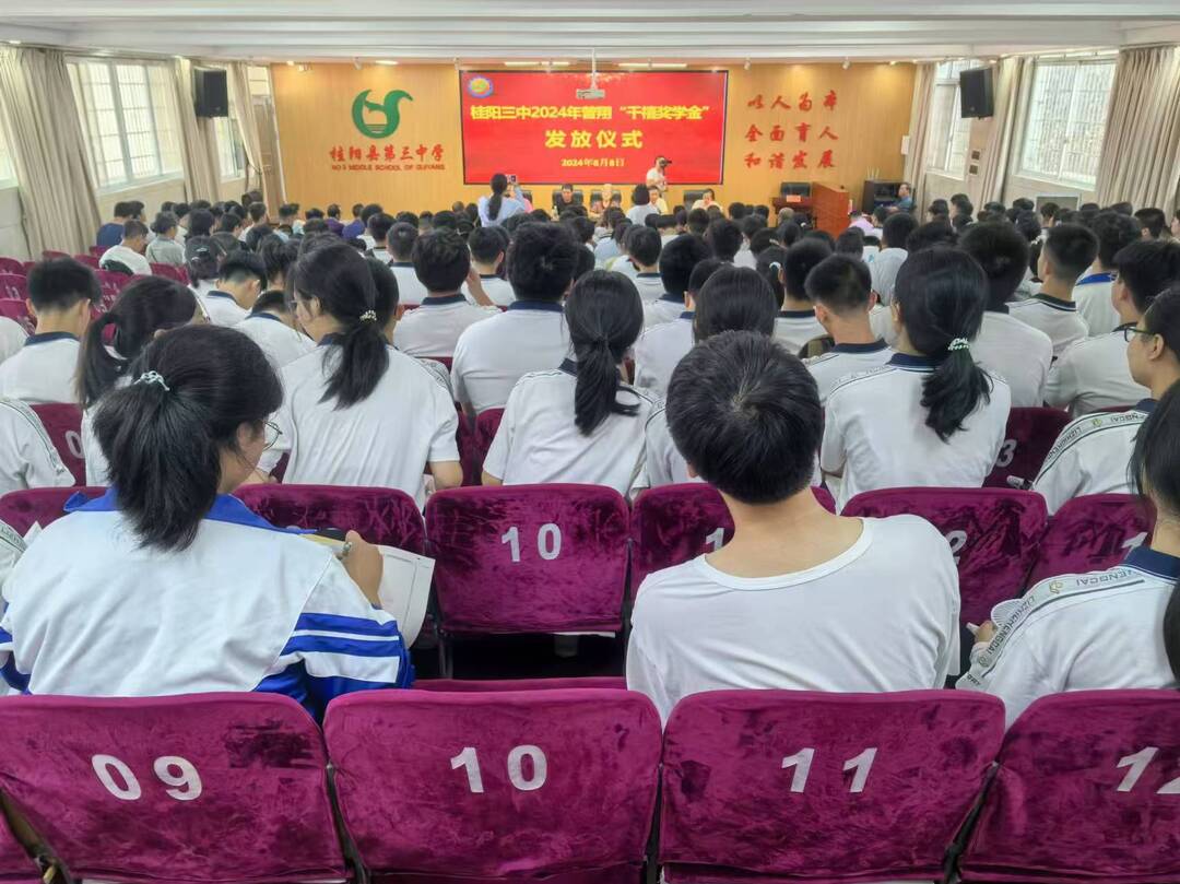 新桂阳8月9日讯(记者 刘娣)8月8日,桂阳三中举行 2024 年曾翔“千禧奖学金”发放仪式,旨在表彰和激励在学业上表现优秀的学生,进一步营造积极向上的学习氛围。
