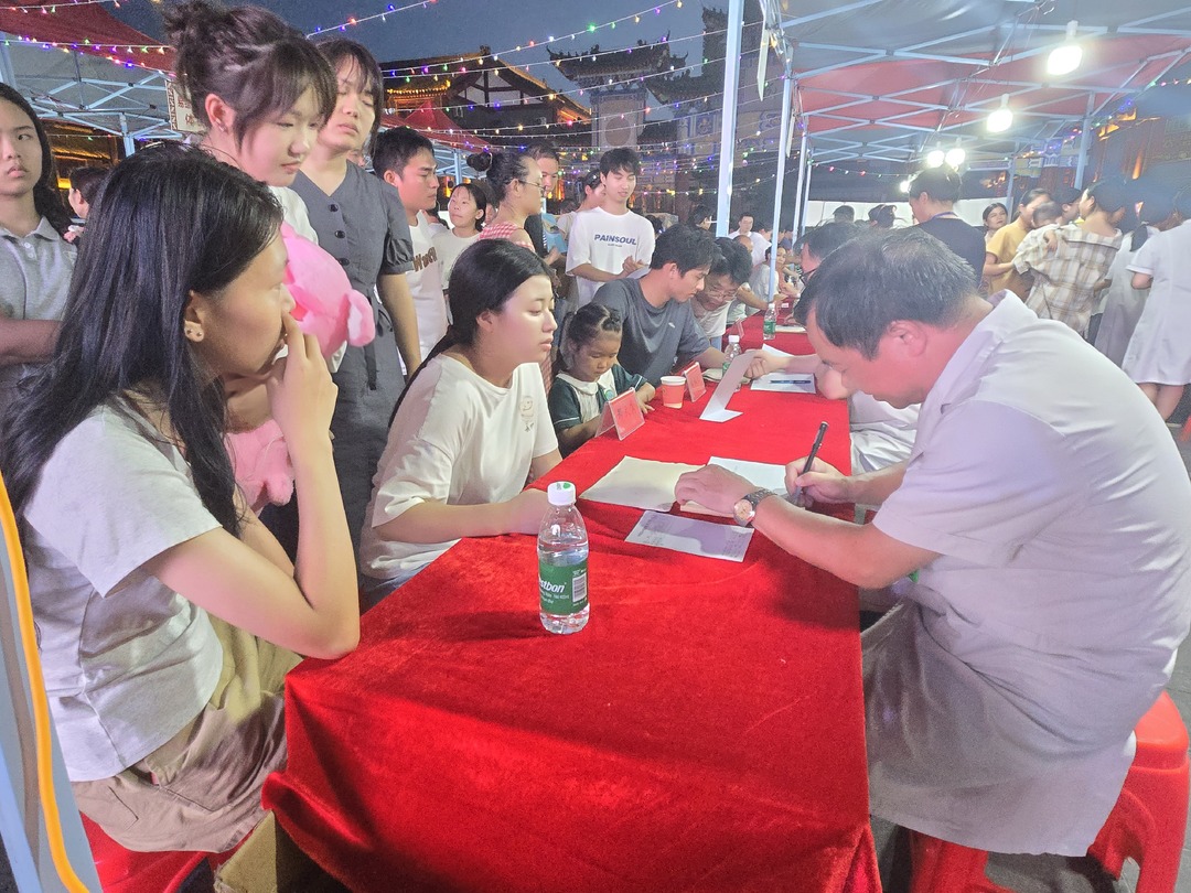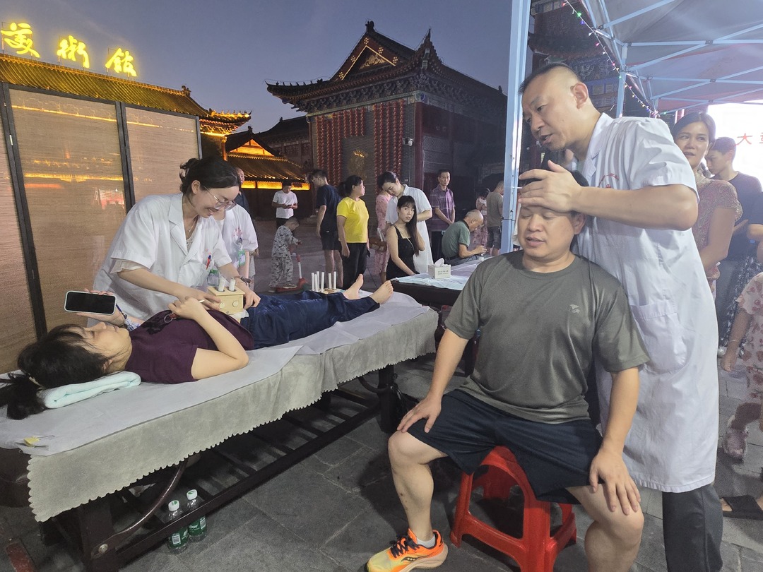 在桂阳文化园,夜晚八点的中医夜市人声鼎沸。不少居民聚集在中医专家义诊区排队候诊,望、闻、问、切,医师们与前来问诊的居民细致交谈并记录病症,指导大家如何通过中医药理念调养身体。夜市上的中医理疗体验区,刮痧、艾灸吸引了不少居民前来体验,医师的专业手法和艾灸刺激让大家体验了不一样的养生理疗。