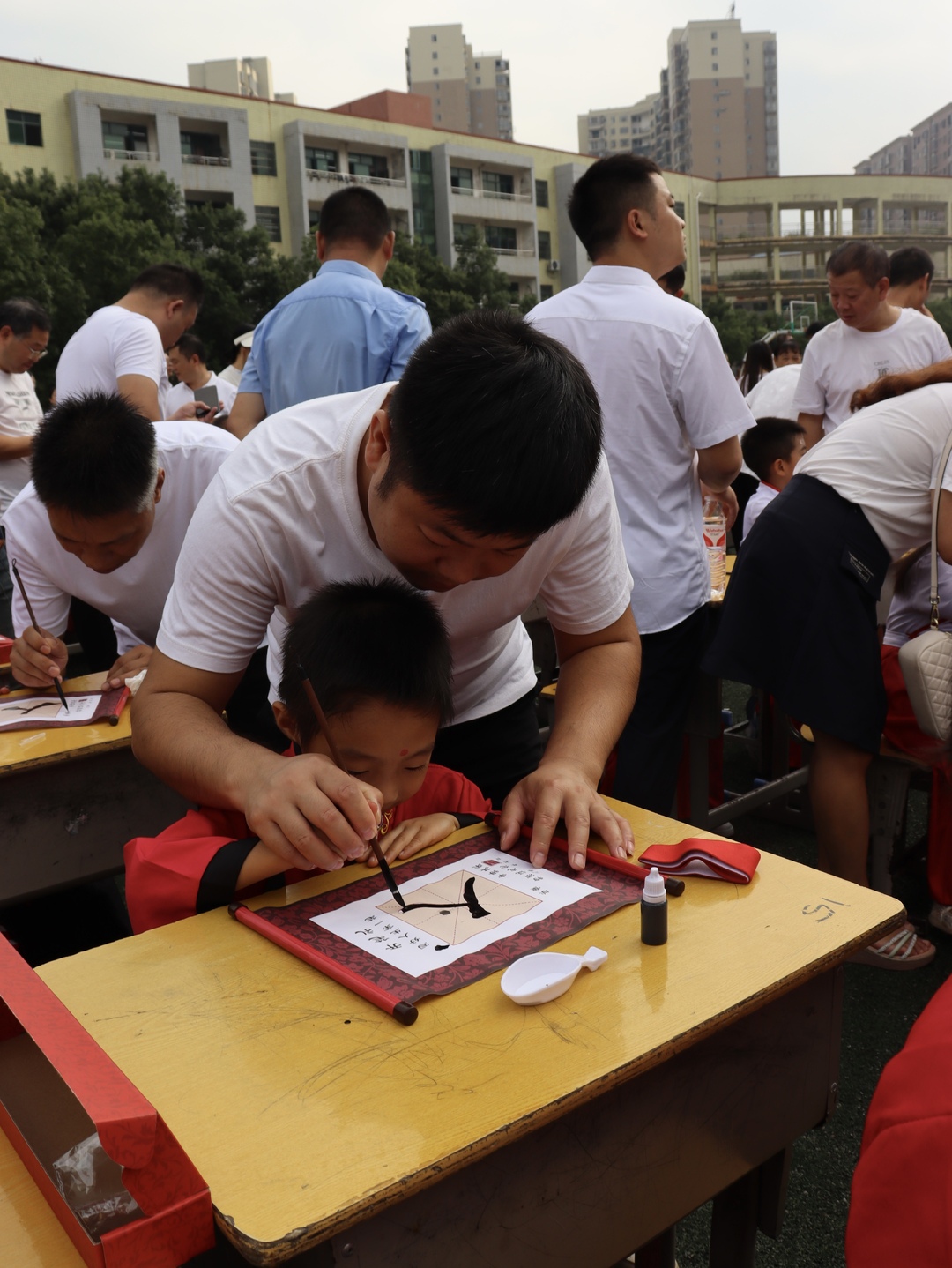 正衣冠,端品行。学生们在老师的引导下,认真整理自己的衣冠,让孩子们明白整洁的外表是对他人的尊重。朱砂启智,点亮心灯。老师们用朱砂在孩子们的额头轻点,寓意着开启智慧之门。 击鼓鸣志,树立理想。学生们依次击鼓,鼓声激昂,振奋人心,他们用稚嫩的声音喊出自己的理想。启蒙描红,书写人生。孩子们拿起毛笔,认真地书写“人”字,老师们用这个简单的汉字,告诉学生其中蕴含的深刻的人生哲理,告诫学生要做一个正直、善良、有担当的人。