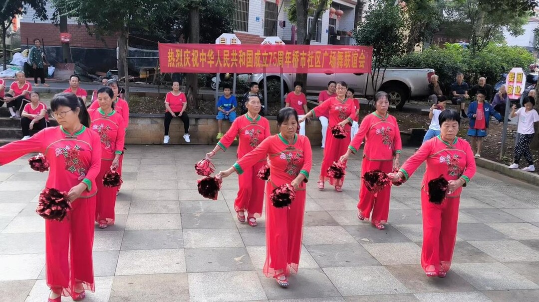 新桂阳 9月30日讯(通讯员 罗玲艳)“五星红旗迎风飘扬,胜利歌声多么响亮,歌唱我们亲爱的祖国,从今走向繁荣富强……”9月28日上午,一曲《歌唱祖国》瞬间点燃了桥市乡桥市社区现场的热烈气氛。为庆祝中华人民共和国成立75周年,该乡新时代文明实践所及各村(社区)共同举行迎国庆广场舞联谊会。