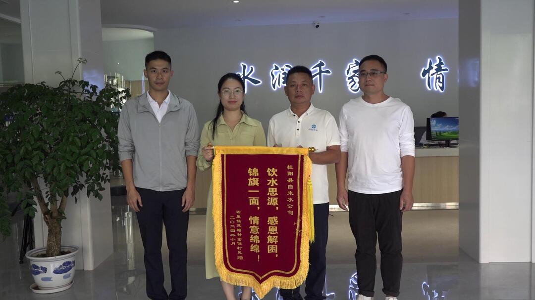 新桂阳 10月14日讯(记者 谭明艳)10月12日,四里镇芙塘村的村民代表将印有“饮水思源,感恩解困,锦旗一面,情意绵绵!”的锦旗送到了县自来水公司,感谢他们为民办实事,让3800余名村民用上了干净的自来水。
