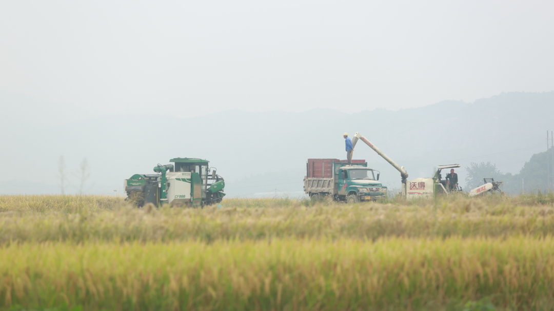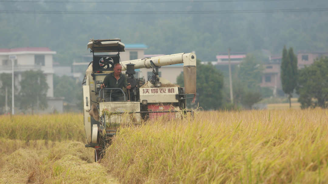 走进太和镇车田村,稻田里沉甸甸的稻穗压弯了稻秆,微风吹过,泛起层层金色稻浪,两台联合收割机在田间轰鸣作响,来回穿梭,稻穗被收割机不断卷入齿轮,切割、脱粒、粉碎秸秆、装车等工序一气呵成,每台机器每天可收割稻谷40亩以上。看着眼前的丰收盛景,种粮大户陈跃进喜上眉梢。今年他承包了1300多亩农田种植晚稻,投入三台收割机进行收割作业,预计将在10天内即可完成晚稻收割。