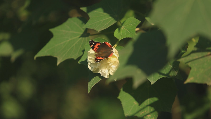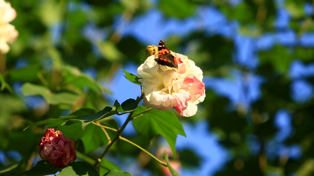 朵朵碗口大的花,层层叠叠地开在枝头,闻香而来的蝴蝶停留在花蕊,花朵愈发娇艳欲滴,楚楚动人。花朵形态丰富,有的娇小玲珑,有的雍容华贵,有的含苞待放,有的则热烈奔放。一树繁花,次第绽放,此白彼红相间,如同一个个顽皮的精灵,在绿叶中跳跃、嬉戏。