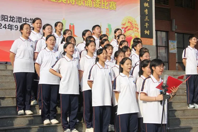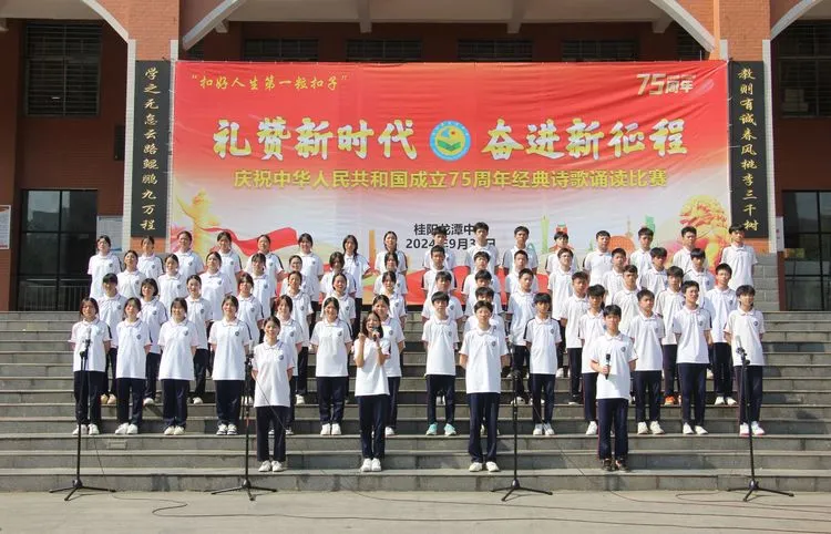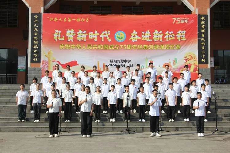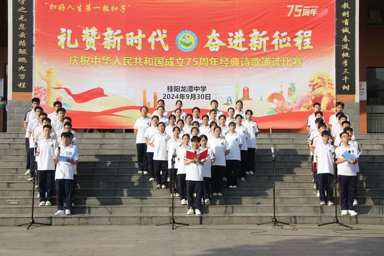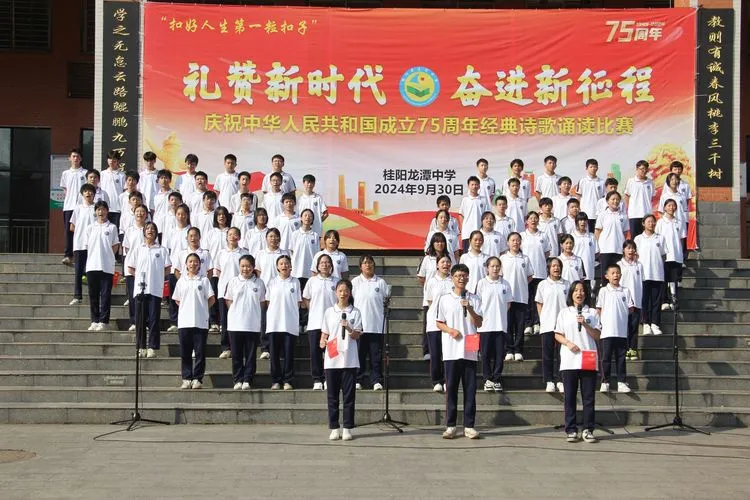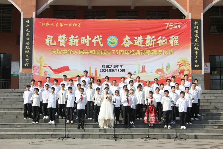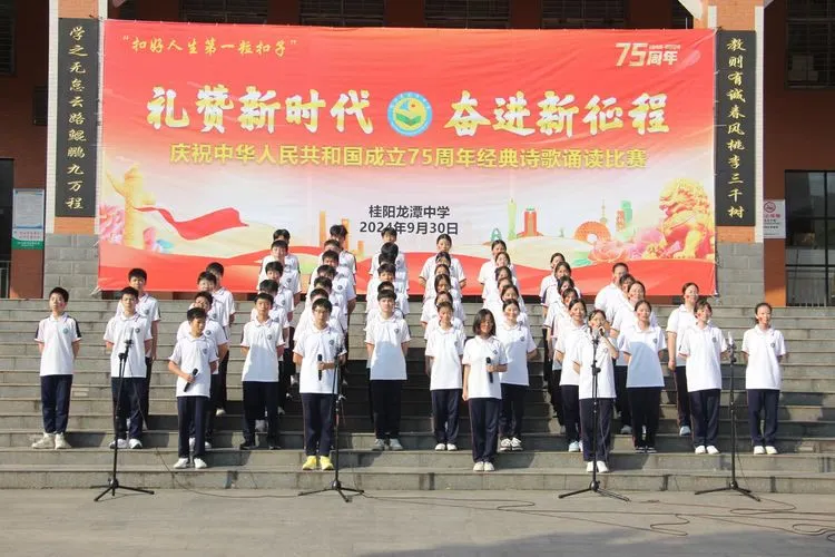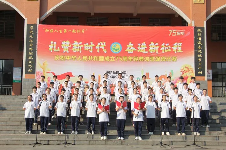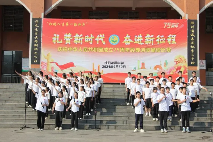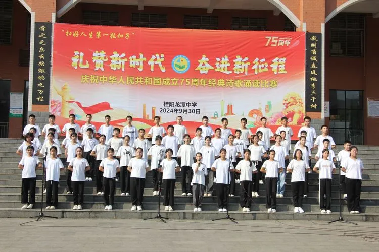 辉煌璀璨七十五,盛世华章耀神州;砥砺奋进新时代,同心共筑中国梦。为深入贯彻党的二十大和二十届三中全会精神,全面落实立德树人根本任务。9月30日上午,桂阳县龙潭中学在学校广场举行了迎国庆经典诗歌朗诵比赛活动。