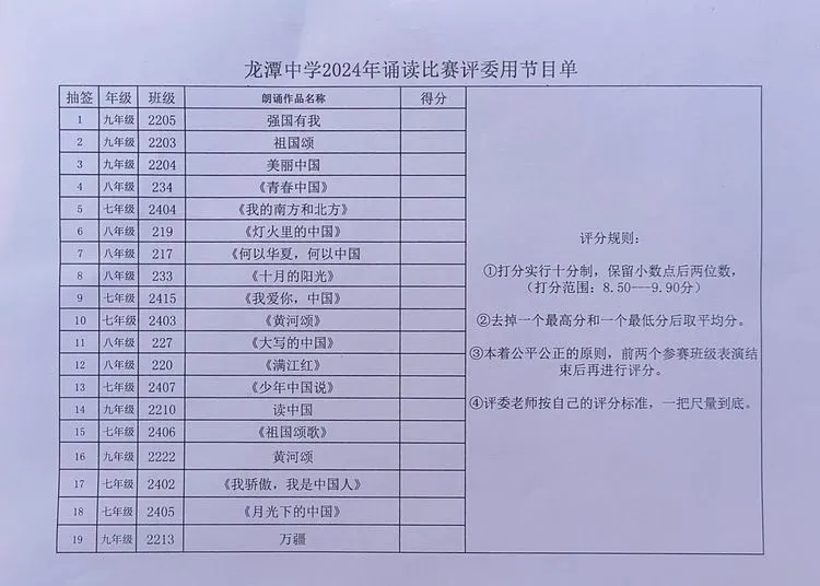 一字一句,字字铿锵;一举一动,尽显昂扬。在这普天同庆的美好时刻,学校通过迎国庆红色经典诵读比赛,为祖国母亲的75华诞献上了一场视觉和心灵的盛宴,让民族精神和爱国情怀在学生心里生根发芽,在未来的日子里,龙潭中学的学子们将带着这份热爱与激情,继续努力学习,奋发向上,为实现中华民族伟大复兴的中国梦贡献自己的青春力量!