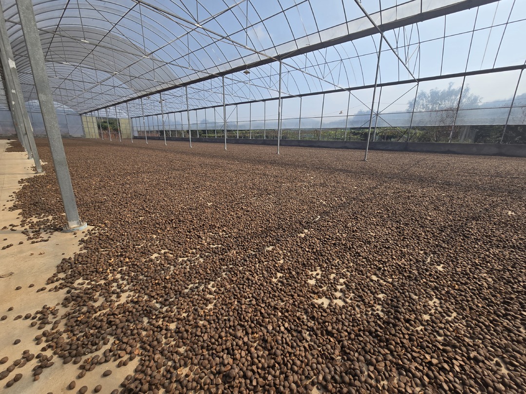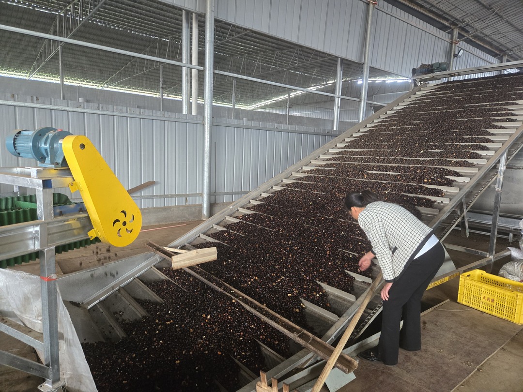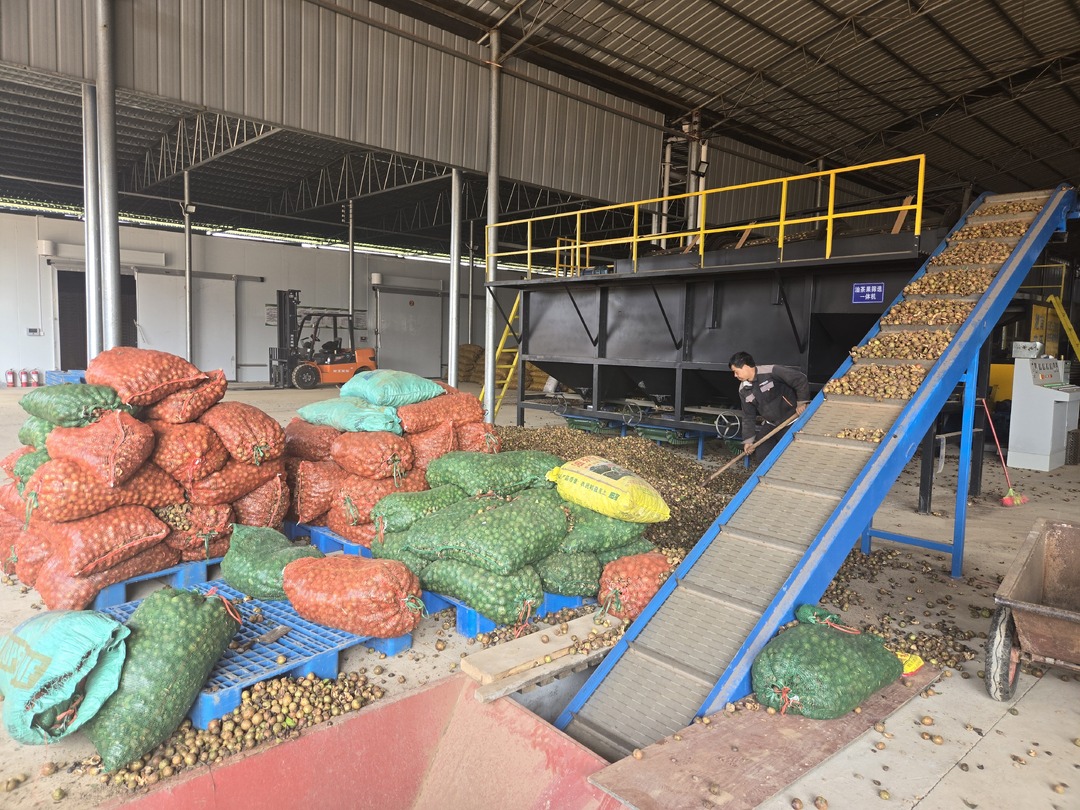 近日,在樟市镇山河村油茶加工场,一袋袋刚采摘的油茶果整齐码放在储货区。在这里,这些油茶果经过筛选、剥壳、清洗、烘烤等工序后,完成从果实到油籽的蜕变。