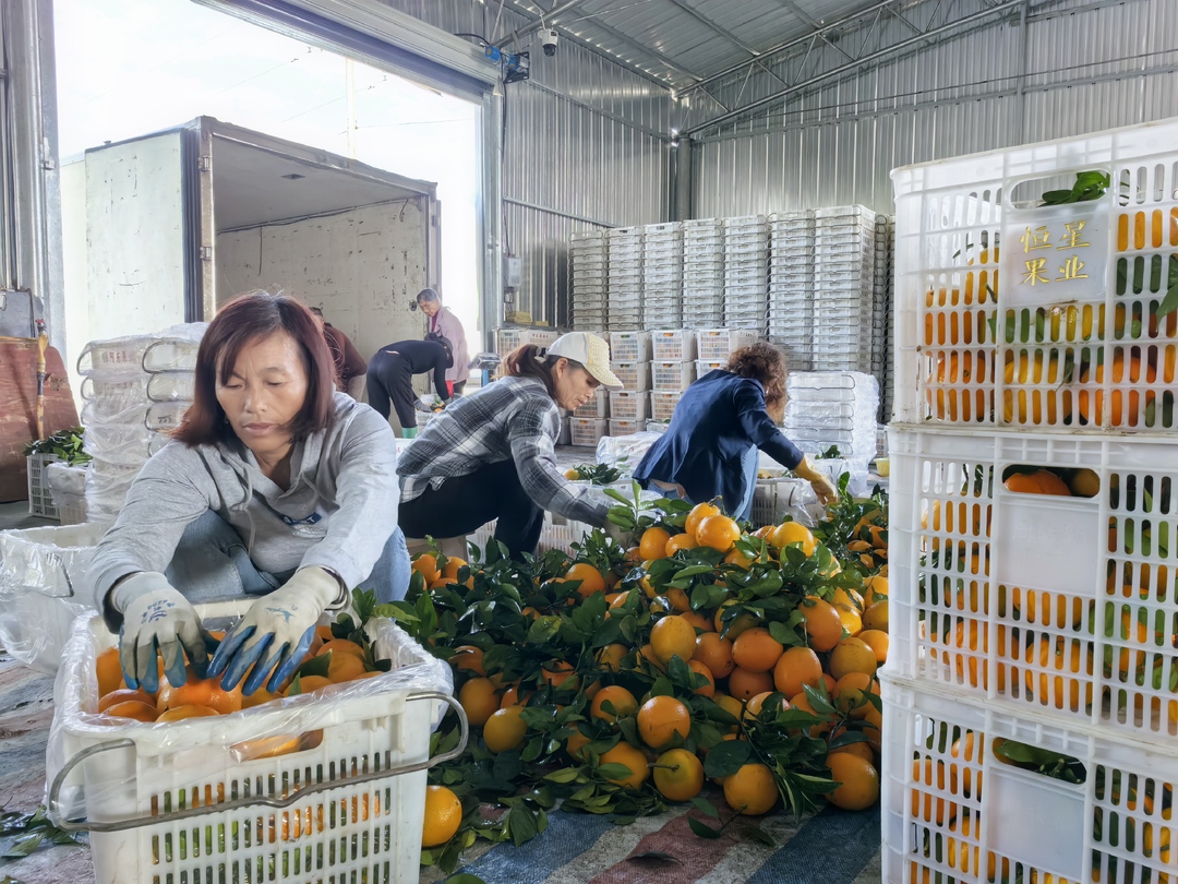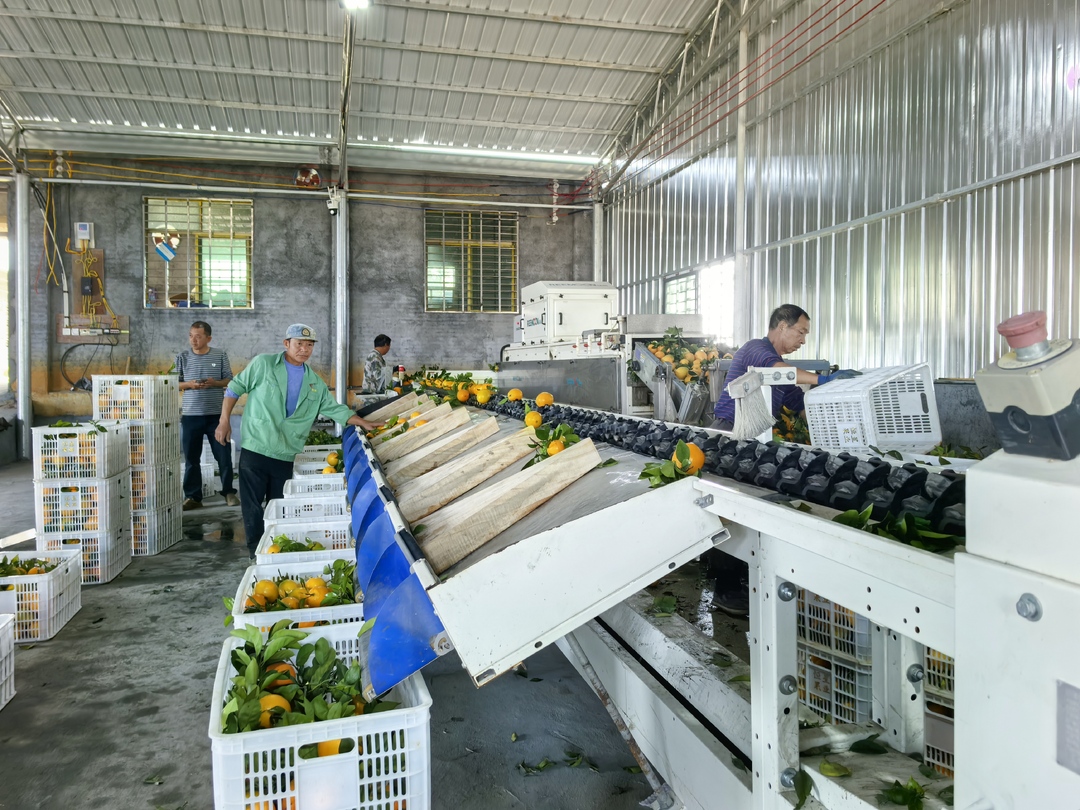 近日,记者走进菖蒲村支部农场万亩脐橙基地,金灿灿的脐橙挂满枝头,在阳光的照射下,显得格外耀眼。果农们穿梭在脐橙树下忙着采摘,一筐筐新鲜的脐橙通过分拣、称重,被打包装上车。