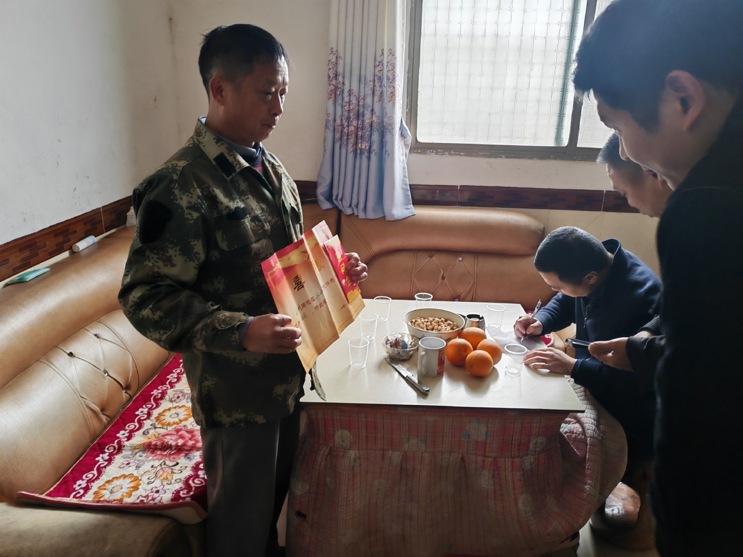 工作人员一行先后来到阴山村现役军人江名䘵家中、山河村退役军人吴志明家中,将喜报郑重交到他们手中,向他们表示最热烈的祝贺。并与军人家属进行亲切交流,详细了解他们的家庭情况和身体状况,对他们支持国防事业和培养了优秀人才表示感谢,并送上了慰问金,切实让军人和家属感受到党和政府的关心关爱。