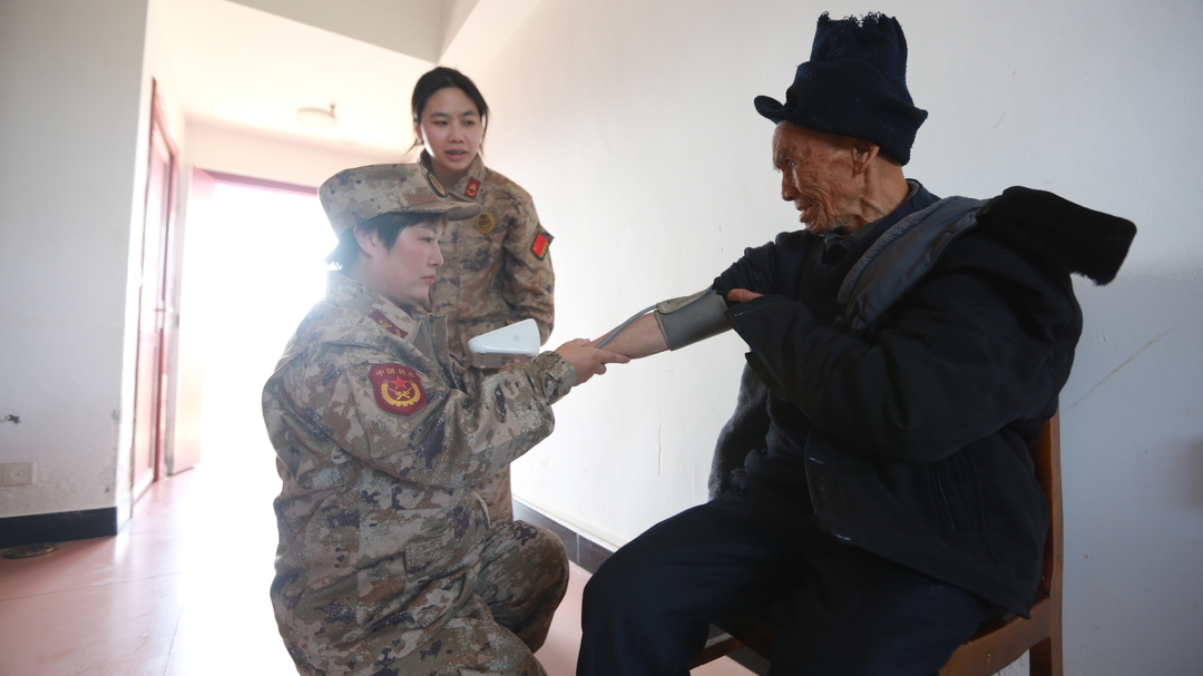 随后,民兵医疗队通过望、闻、问、切,为老人们提供个性化的诊疗建议和健康指导,耐心地为他们量血压、测血糖、进行心肺听诊等检查,对常见病、慢性病等进行初步诊断。