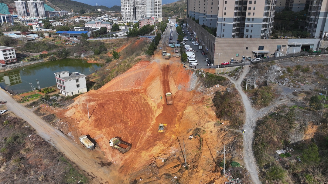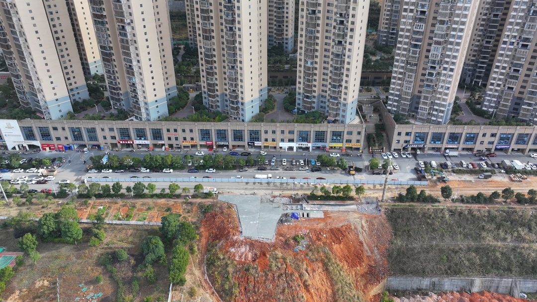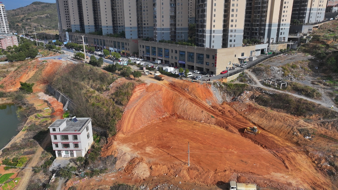 在施工现场陡坡下方的区域,挖掘机、铲车、渣土车、洒水车等各类工程机械车辆往来穿梭,忙碌不停。由于二期工程与一期工程存在十余米的落差,需进行填土降坡作业。