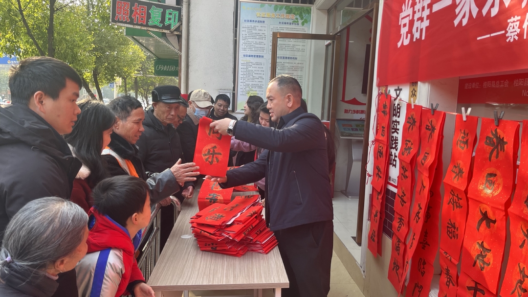 在蔡伦井社区,志愿者现场书写春联,提供春联大全让居民定制。工作人员将一副副“新鲜出炉”的春联交到居民手中,大家拿到中意的春联,脸上洋溢着喜悦之情。