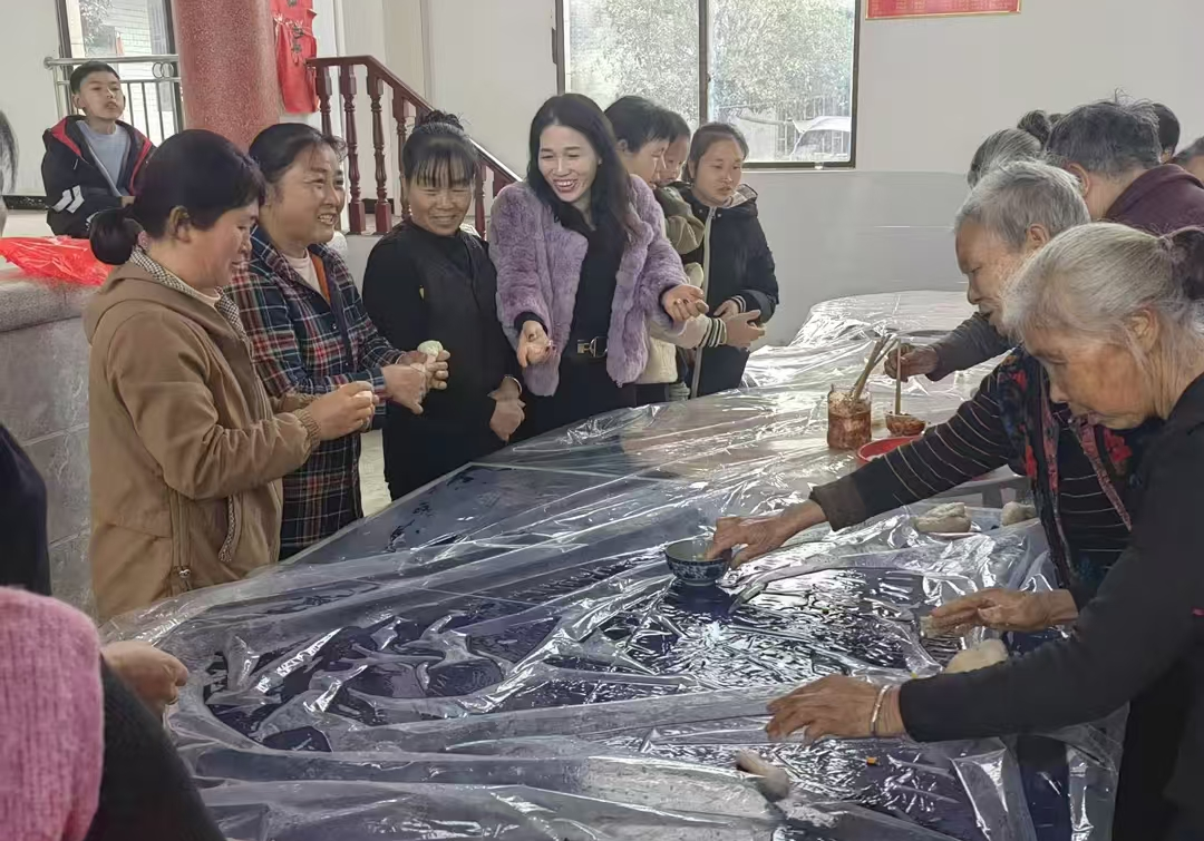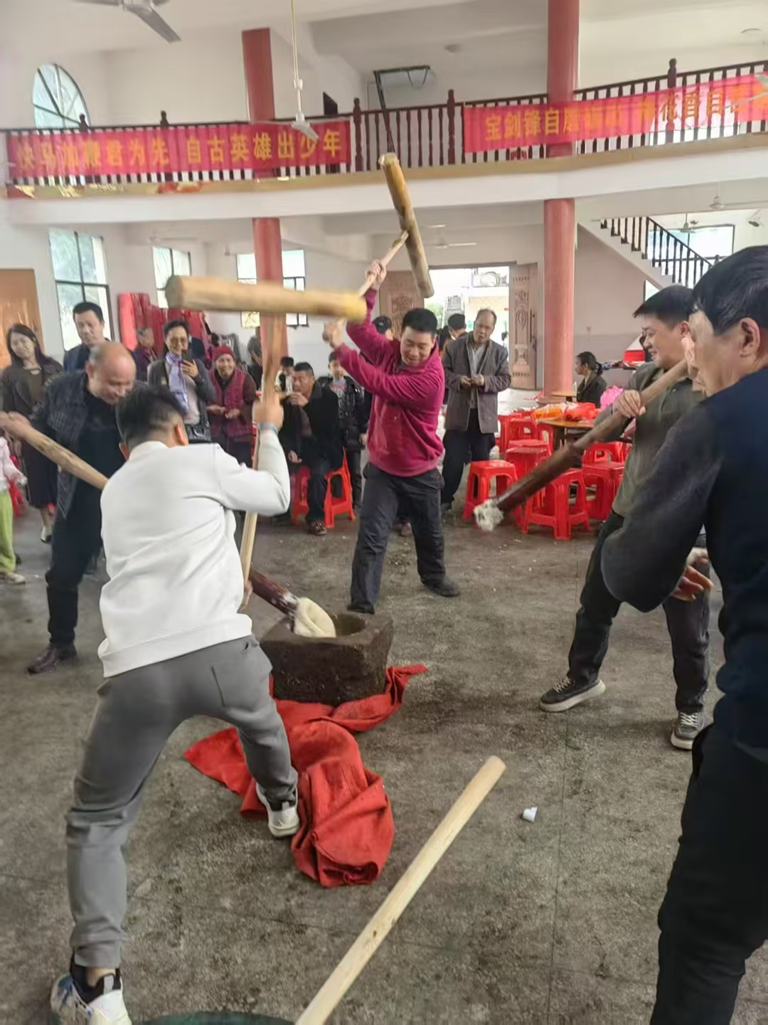 打糍粑,是迎接春节的一项传统习俗,是亲情、乡情融汇的过程,是对新年生活的甜蜜美好祝愿。现场气氛热烈非凡,欢声笑语此起彼伏,村中男性踊跃参与,脱去厚重的外套,手里拿着粑杵围成一圈,个个铆足了力气,仿佛要把过节的热情与新年的期许通通揉进糍粑里。接着,志愿者们将打好的糯米做成米团,阵阵清香扑鼻而来,大家分享着热气腾腾的糍粑相互诉说着对新春的祝福。