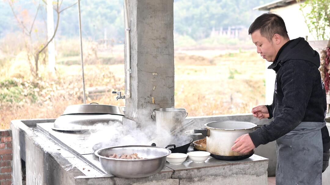 在正和镇,厨房中烟火升腾,厨师龙江正在精心烹制桂阳头碗鲜,这道菜的食材非常讲究。