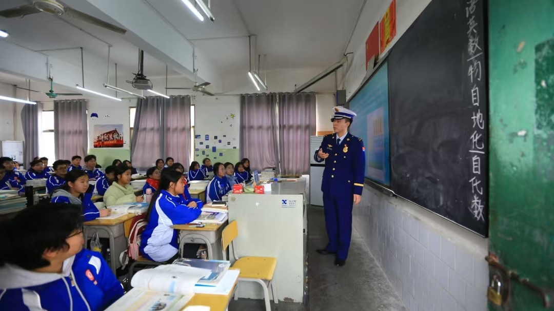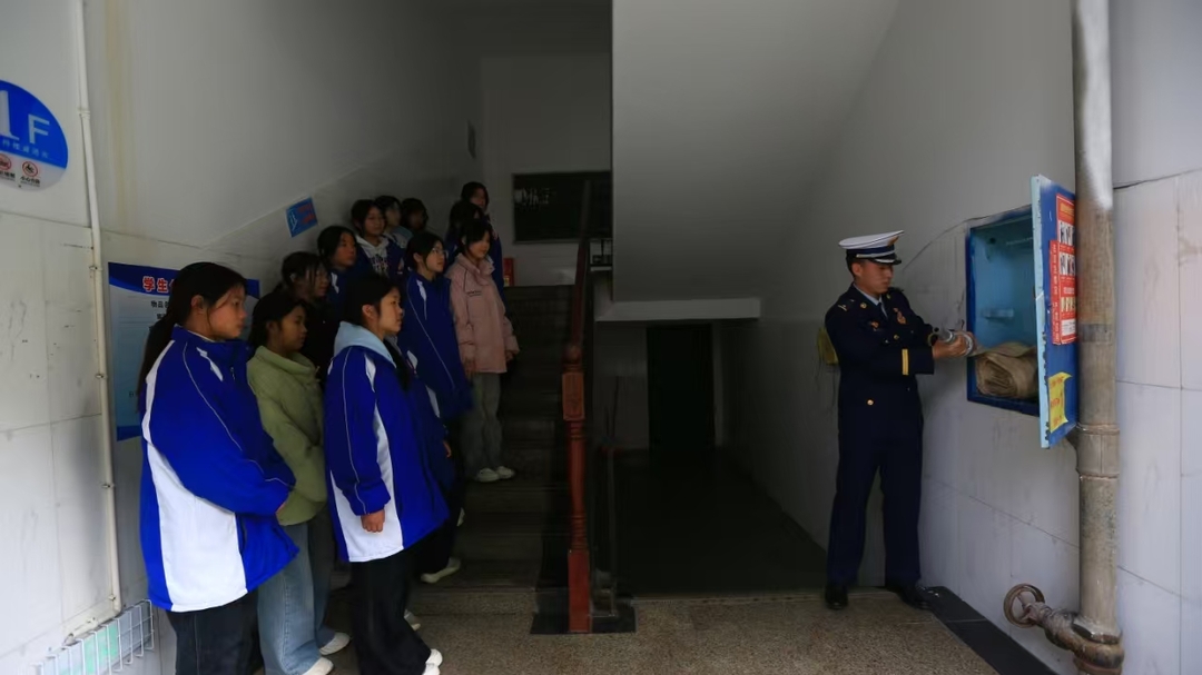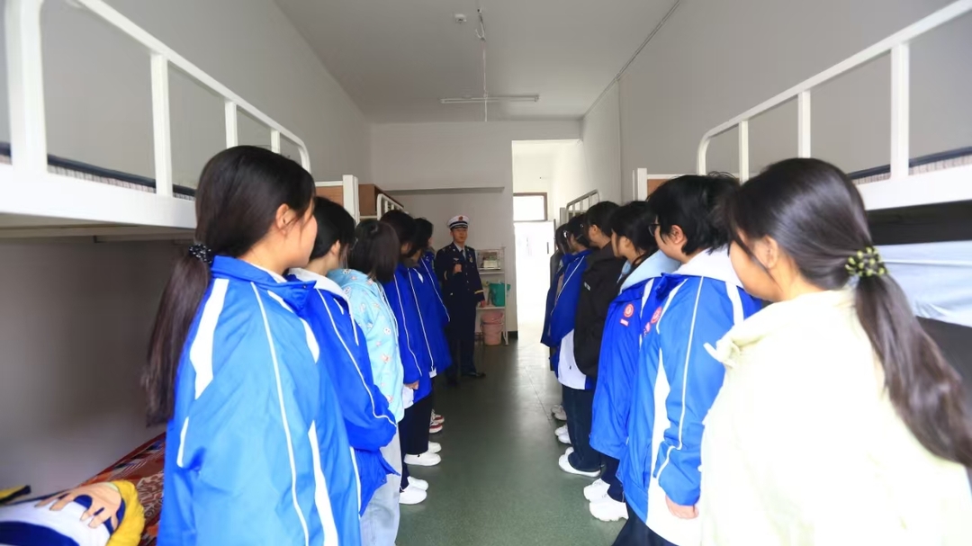 在桂阳一中学生宿舍,消防指战员正在为学生们讲解寝室用电安全规范和消防应急常识,针对校园宿舍人员密集、用电频繁的特点,消防员通过真实案例,向学生们剖析违规使用电器、私拉电线的危害,并现场演示如何排查宿舍安全隐患,以及如何使用消防救援器械。