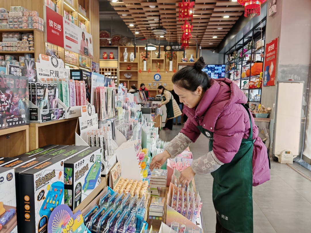 “春季开学,我们经营速干笔类、功能本册类产品销售更为突出,近期上映的《哪吒》电影相当火爆,我们店关于哪吒的文创系列也深受学生喜爱,新学期我们推出了满送活动,得到学生的喜欢。为进一步满足学生的需求,我们将会推出更加新颖的产品供学生选购。” 桂阳县智慧文体店 店长张艳红说。