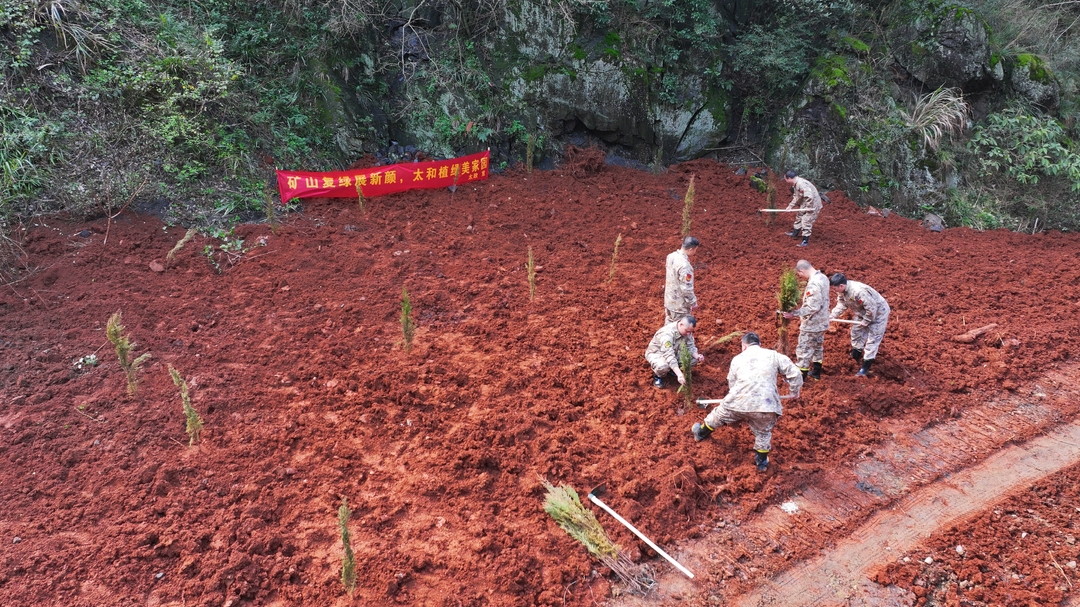 在太和镇太清矿区太和片区山涧段,民兵们松土、挖刨、栽种、压实,在一轮轮的辛勤劳动下,翠绿的柏树苗、油桐、栾树扎根在矿山土地上,为矿山复绿再添力量。太和镇民兵应急排排长欧阳晓宏说:“今天是植树节,我们加入到矿山修复的这个植树队伍中,希望通过我们的努力,让我们的后代,让更多人享受到绿水青山的生态环境。”