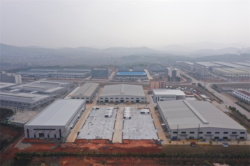 桂阳高新区企业服务专员李晨曦介绍道,“目前一期已经全面投产,二期完成总工程量85%,已经完成了二期道路施工,四栋五栋钢构厂房完成基础及场内硬化。”