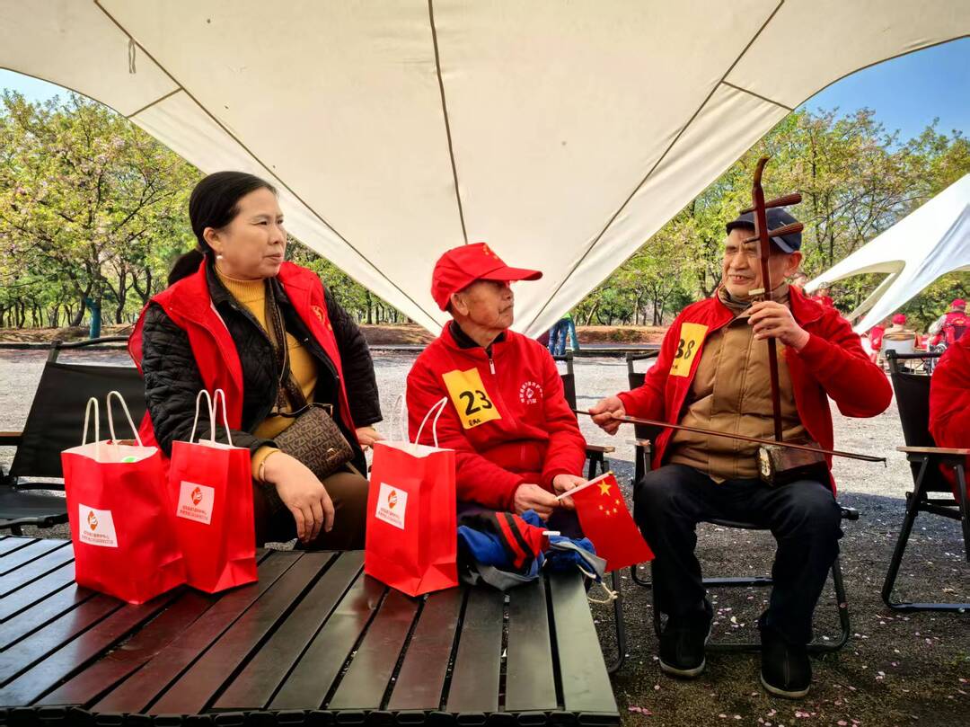 樱花园里樱花烂漫,粉色的花瓣在微风中轻轻摇曳。老人们热情高涨,放声高歌经典革命歌曲,熟悉的旋律引得现场不少人合唱;还有老人随着二胡声翩翩起舞,虽然步伐不再轻盈,但脸上洋溢的笑容充满了感染力。
