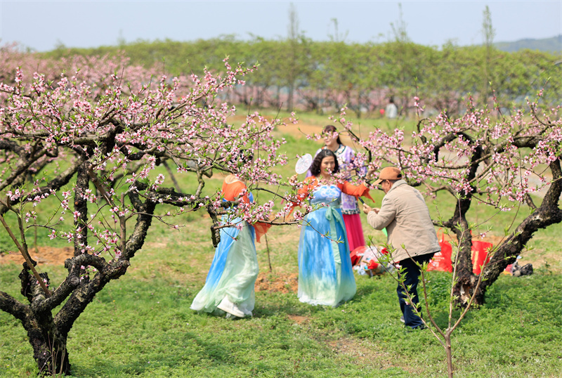 不少游客,趁着晴好天气,相邀一起到这里看桃花,她们身着古风长裙,衣袂飘飘,穿梭在花海中,恣意畅享美好春光,时而携手赏花、时而欢歌笑语、时而拍照留念,记录着春日无限美好时光。