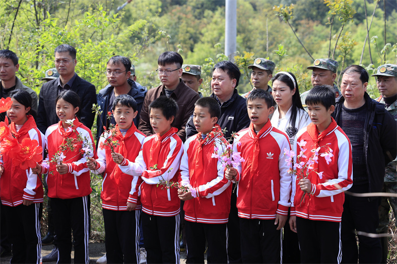 这座无名红军墓位于芹溪村后山腰,墓碑旁,大家伫立默哀、手捧映山红唱响红色歌曲《映山红》,并重温三大纪律八项注意。1934年,中国工农红军红六军团从湘赣革命根据地突围西征。红六军团其中一路经过四里镇芹溪村,一位负伤的小战士牺牲后长眠于此,村里人将他妥善安葬,自此,守护好红军墓成了村里代代相传的承诺和使命。
