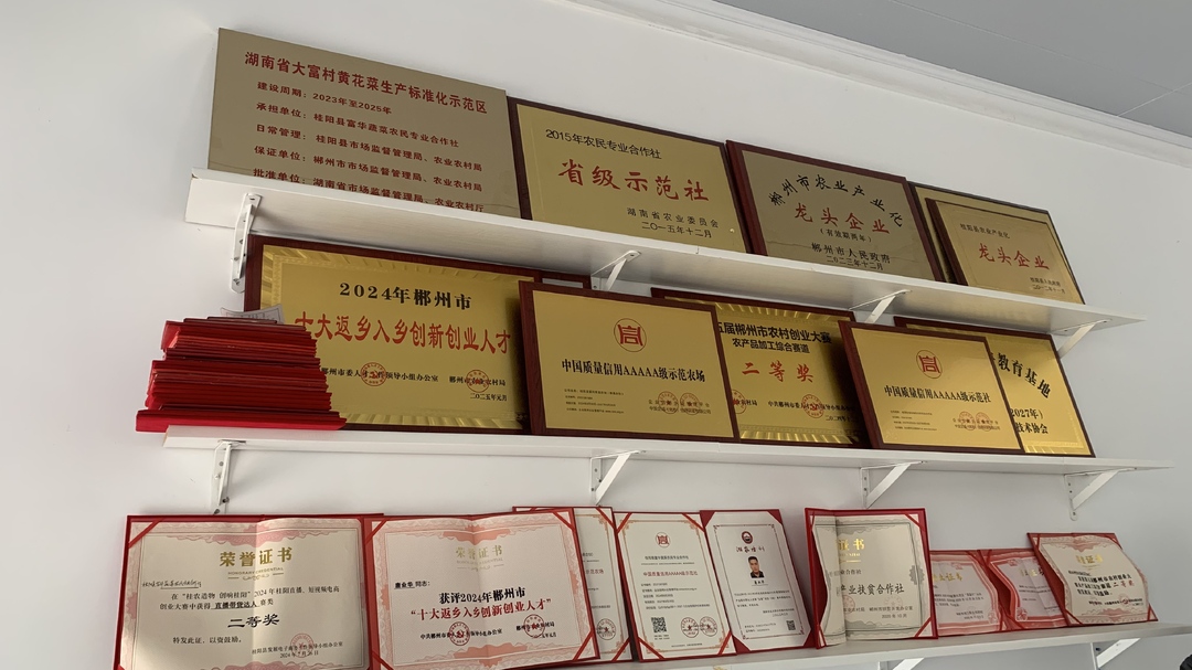 去年,唐业华种植的黄花菜亩产突破1000公斤,经采摘、冷鲜、蒸制、烘烤、质检等工序,7公斤鲜黄花菜可以制出1公斤成品。每亩黄花菜可制干货150公斤,年产量超20万公斤,年产值超1200万元。富华蔬菜农民专业合作社还是粤港澳大湾区“菜篮子”生产基地合作伙伴,每年生产的黄花菜制品有三分之一售往粤港澳大湾区。富华蔬菜农民专业合作社也先后被评为市、县农业产业化龙头企业,2024年获评“湘江源”蔬菜省级区域公用品牌基地和中国质量信用5A级示范社。