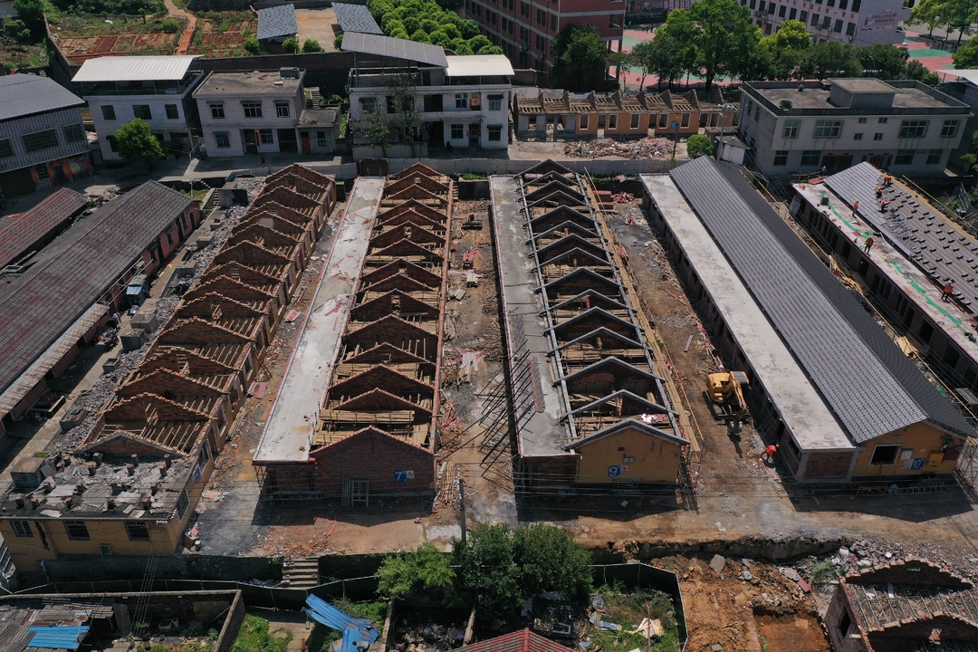 在老旧房屋提质改造修葺现场,施工方对老旧平房进行屋顶重建、内外墙装饰和水、电、气改造工作。施工人员将屋顶破损的琉璃瓦统一更换为更轻便、牢固、环保的树脂屋顶。此次提质改造,通过加固结构、更新管网,为黄沙坪社区四村、二村675户居民的老旧住宅进行房屋修葺,优化公共空间,改善老旧住宅区生活环境。