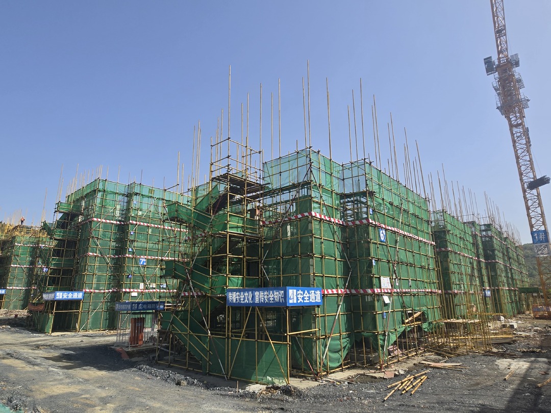 在黄沙坪独立工矿区避险搬迁房屋新建施工现场,从外观上已经可见建筑主体3至5层楼高的建设进度。工人们正忙着搭建脚手架,完成楼层之间楼板封层。避险搬迁房屋新建项目于2024年12月底动工,计划建设13栋总建筑面积1.8万平方米的单体住宅,建成后将容纳304户家庭安置。
