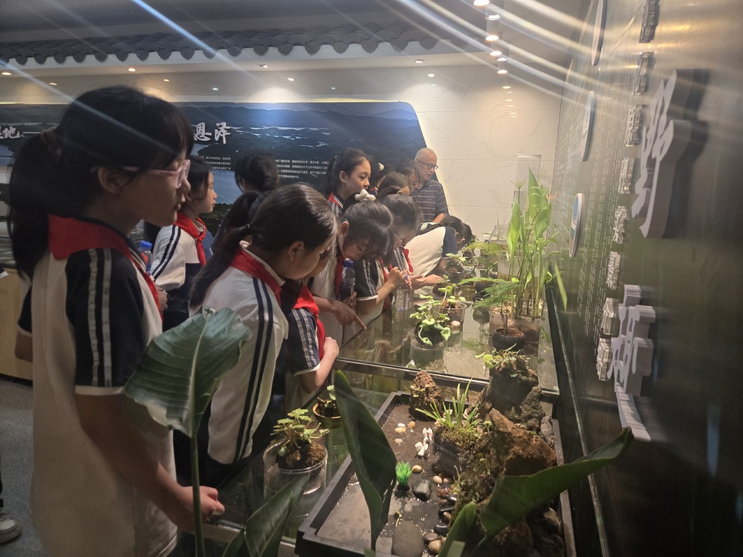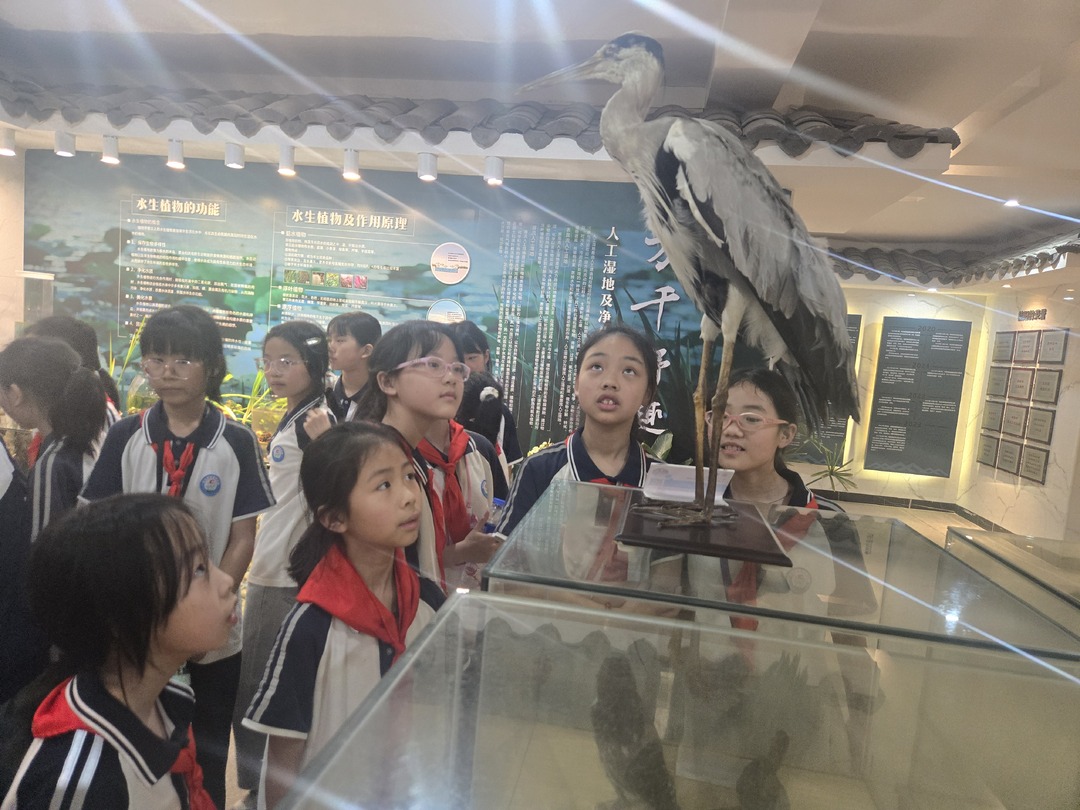 在宣教中心标本展示区,数量繁多的珍稀鸟类和植物标本吸引了孩子们的眼球。学生们漫步其中,仔细观察水培湿地植株和动植物标本。宣讲员向大家介绍湿地生态系统动植物生活习性,宣讲爱护野生动物,保护生态环境。