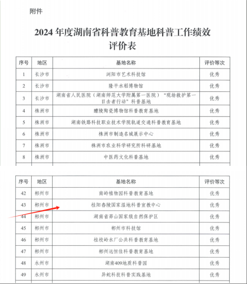 新桂阳 5 月 9 日讯 今日,《湖南省科学技术协会关于公布湖南省科普教育基地 2024 年度绩效评价结果的通知》发布,桂阳舂陵国家湿地科普宣教中心从 275 家参评单位中脱颖而出,获评 “优秀” 等次。