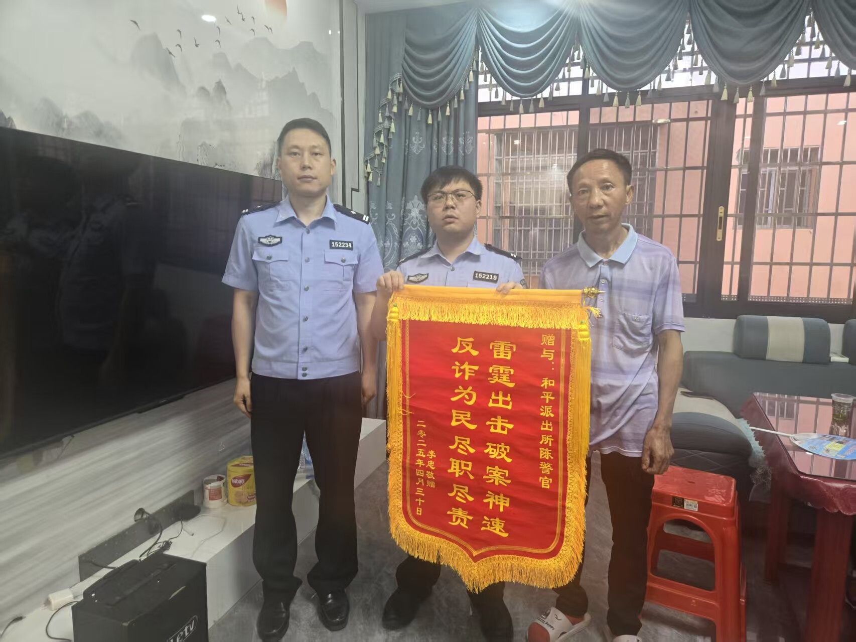 在和平镇,李先生向来家中回访的办案民警赠送锦旗,感谢他们破案迅速,为自己追回了全部受骗资金。