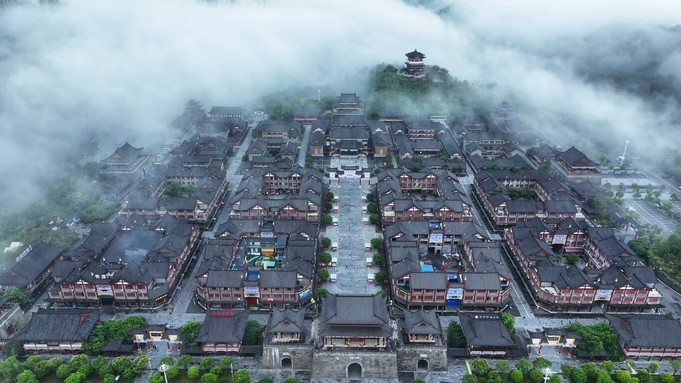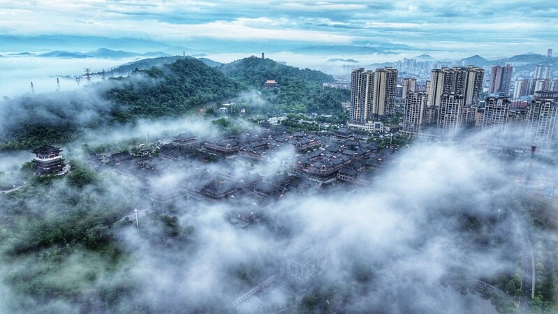 雾气弥漫中,桂阳文化园更显神秘与壮丽。从高空俯瞰,虚无缥缈的云雾与多色的天空交织在一起,连绵起伏的群山、古色古香的城楼以及耸入天际的东塔,仿佛在飘忽的云中融为了一体,如缥缈的天宫。