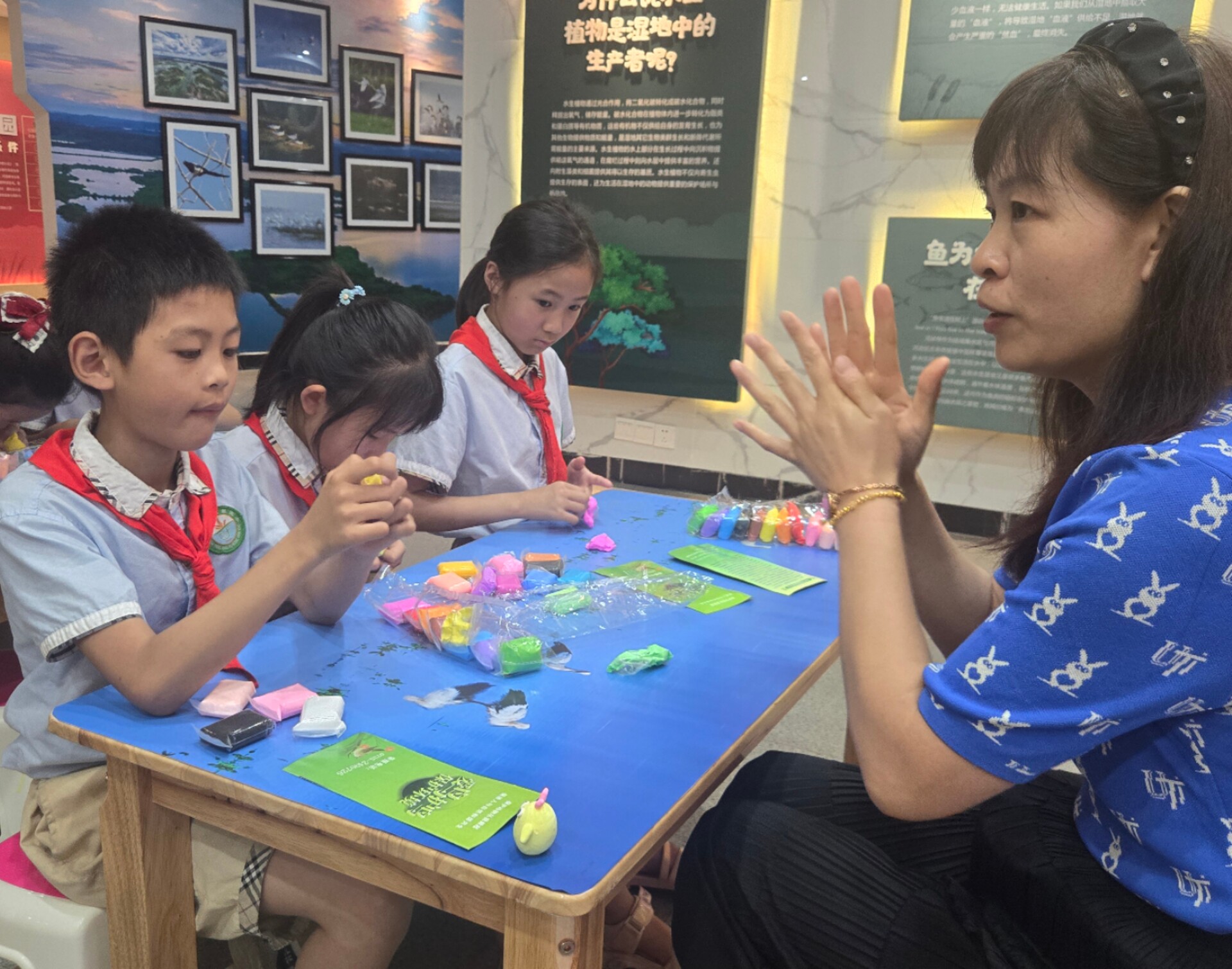 随后的环保课堂上,学生们尽情发挥自己的想象力,用彩色黏土制作白鹭、鸳鸯、猫头鹰等趣味动物模型。用童心表达环保理念,倡导地球生物多样性健康发展。