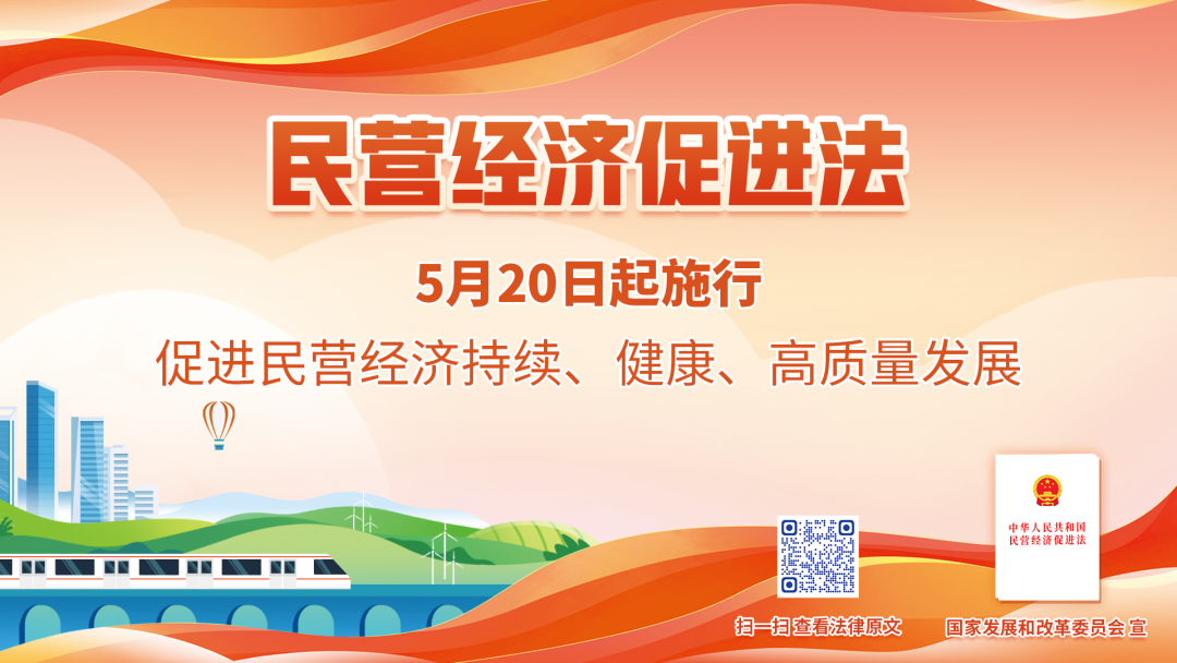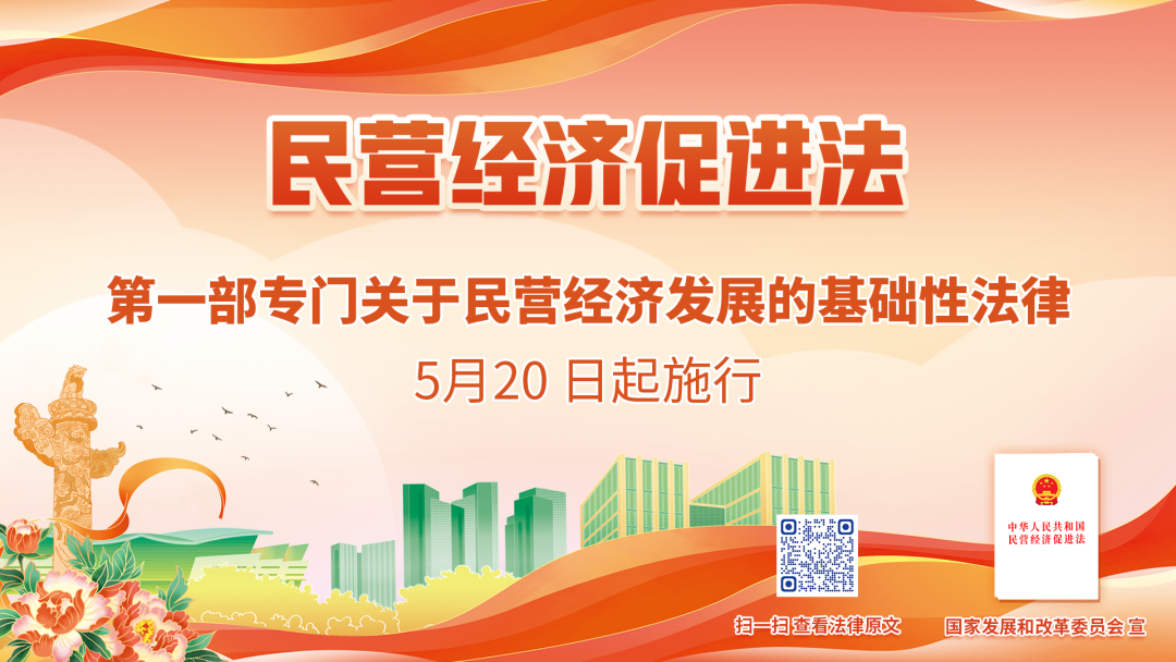 《中华人民共和国民营经济促进法》自2025年5月20日起施行。国家发展改革委制作了宣传海报,供免费下载使用。高清版海报已加载国家发展改革委网站民营经济综合服务平台