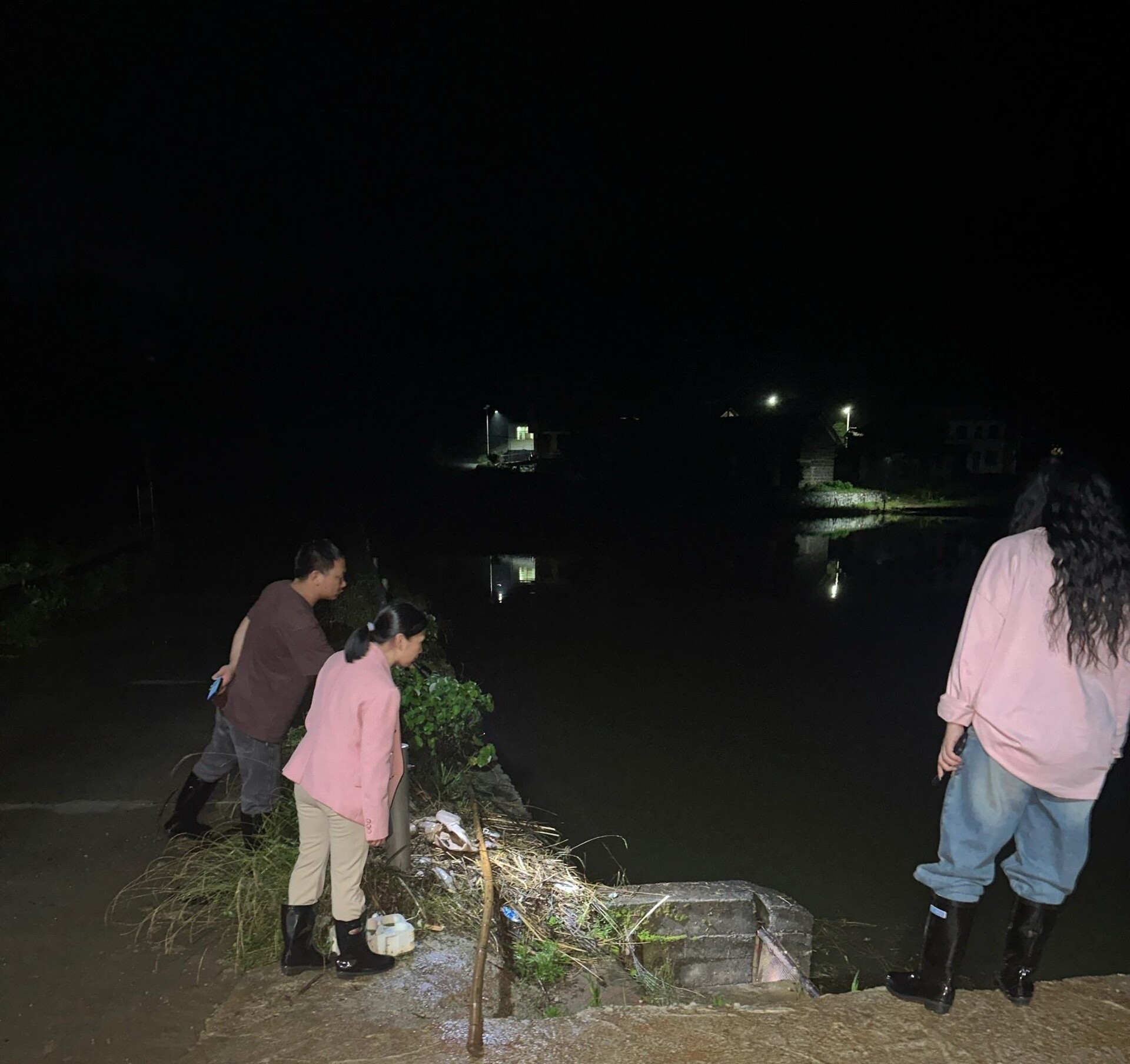 (图为5月27日晚 街道干部到阳王村查看山塘情况)