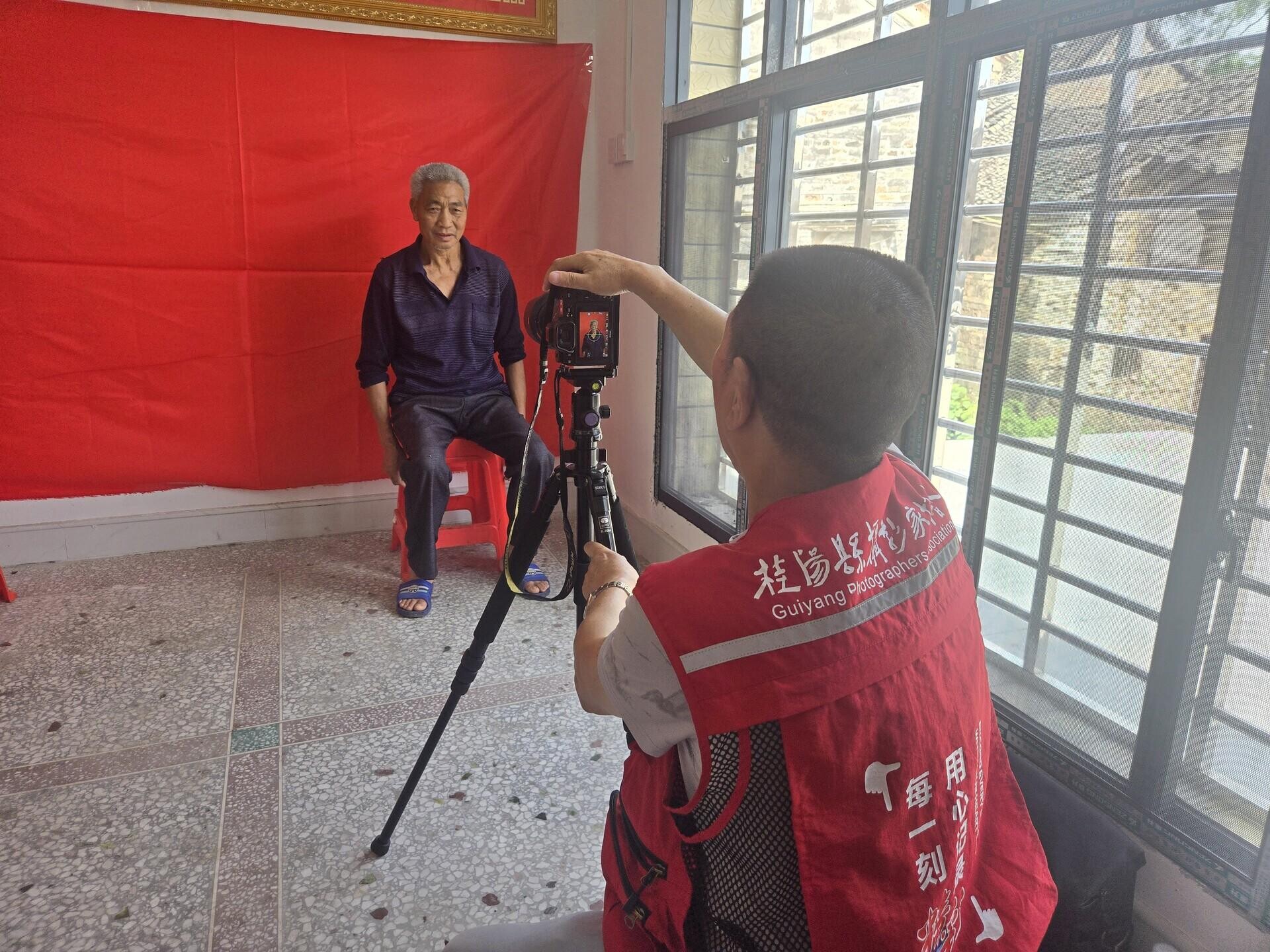 在舂陵江镇钟家村文化活动中心,县摄影家协会志愿者携带专业设备在礼堂搭建起临时摄影棚,耐心地为老人整理服装、打理仪容,引导他们表现出自然的神情,捕捉老人们的笑脸。