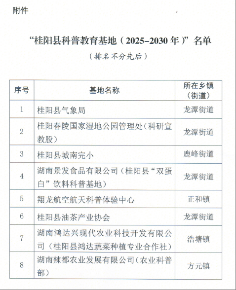 本次共有8家单位被认定为“桂阳县科普教育基地(2025 - 2030 年)”。