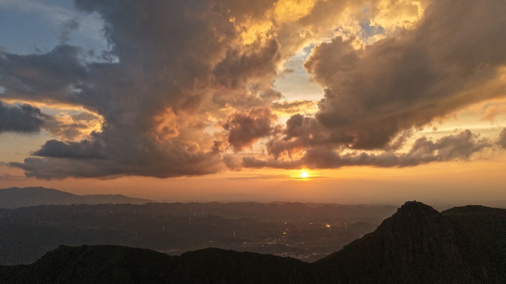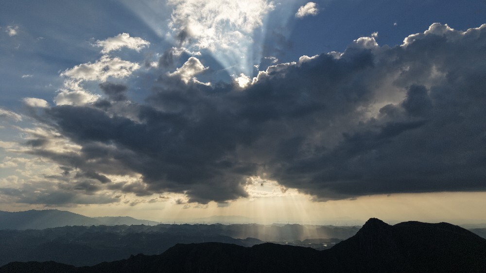 新桂阳6月10日讯(记者 陈勇 通讯员 唐俊)近日,金仙寨出现“丁达尔”现象,金色的阳光穿透厚厚的云层,从天空中倾泻而下,与周围的仰天巨佛、群山、村庄、风电相互辉映。随着光影交错、变幻,倾泻而下的“丁达尔”光速在群山、村舍中移步换景,让人叹为观止。时间推移,天空中橘色的云朵与青蓝色的云层相互交融、变幻莫测,呈现出麒麟喷火、佛手探天等奇幻云景观,更为古老的金仙寨增添了几分神秘气息。