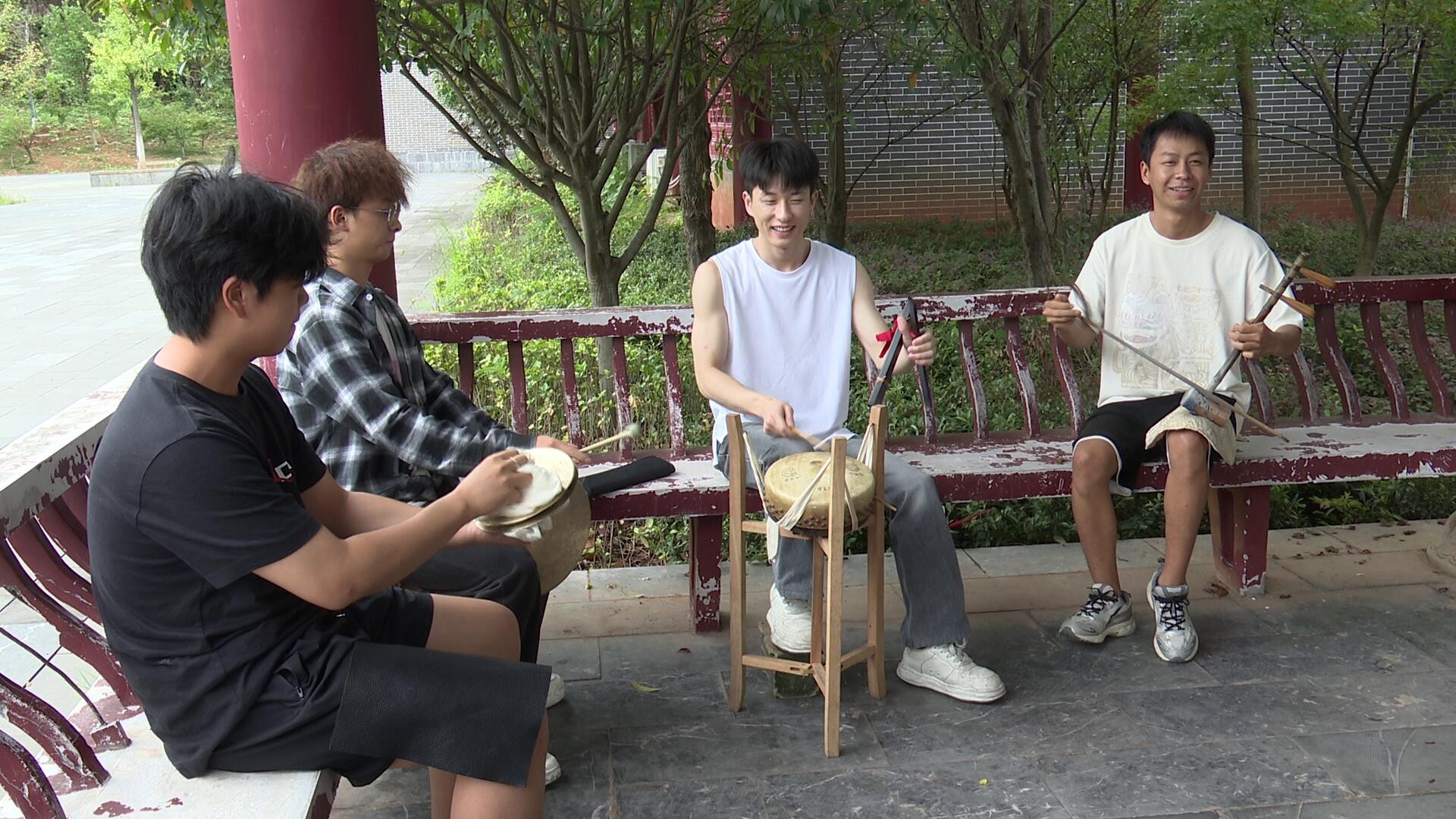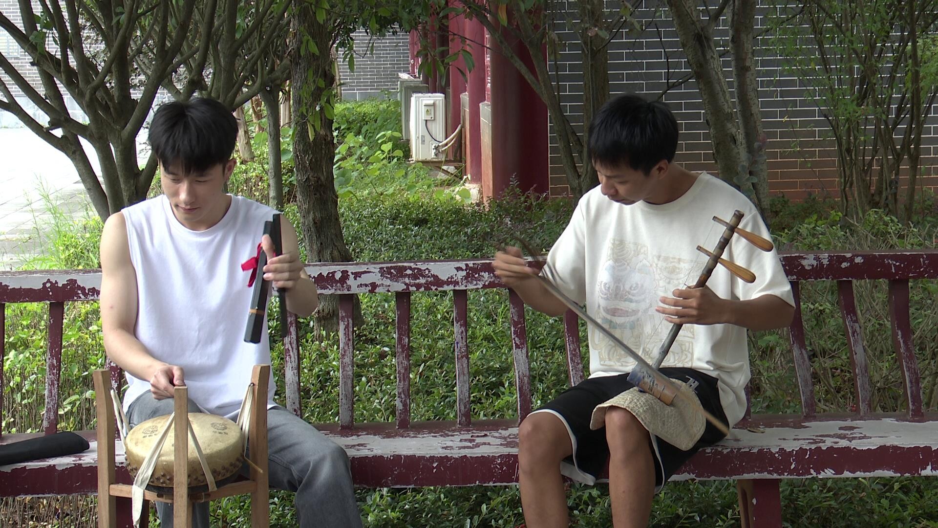 参赛选手罗经春今年22岁,是桂阳县流峰镇塘源村人,他的参赛曲目为二胡打击乐器合奏《迎春》。他邀请了有同样爱好的小伙伴们组建队伍参加比赛,每天在文化园里举行排练。大家围绕《迎春》这首兼具地方特色与大众熟知的曲目反复打磨,从节奏统一到音色融合,不放过任何细节。