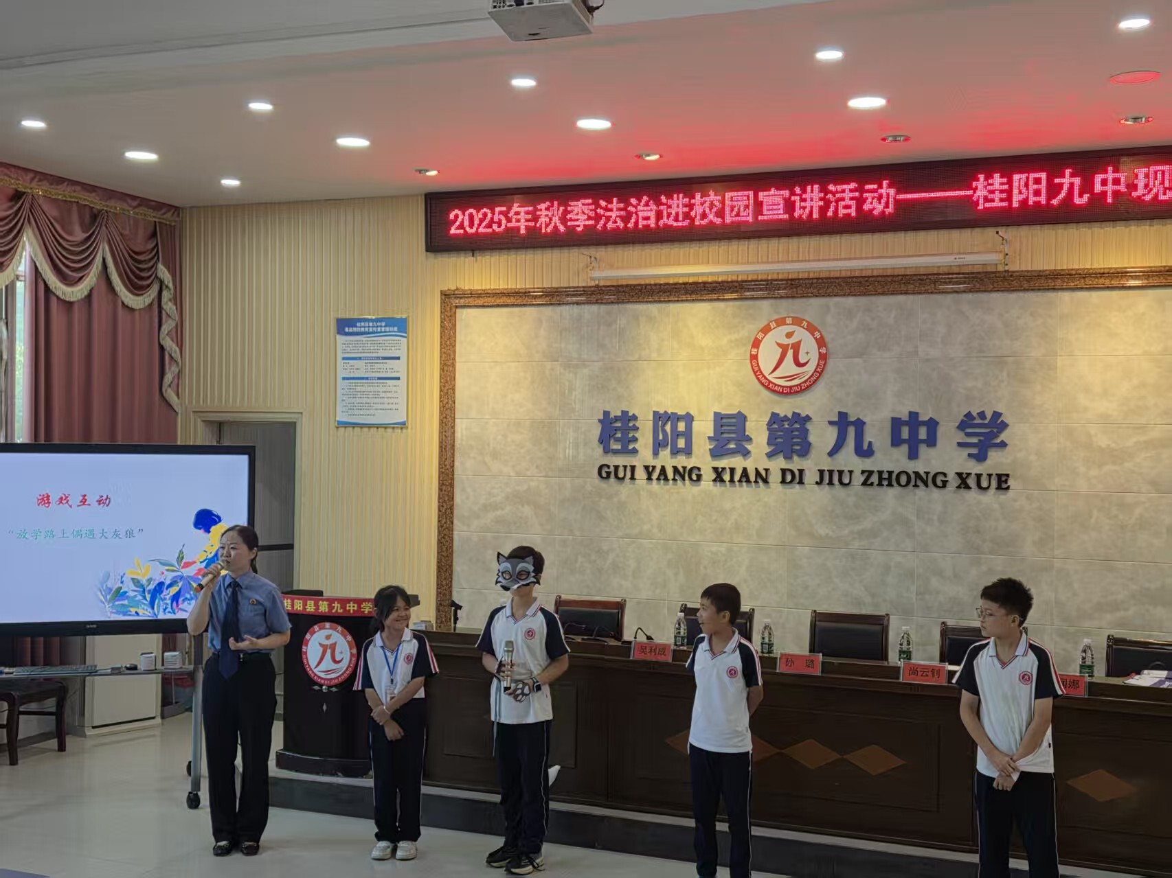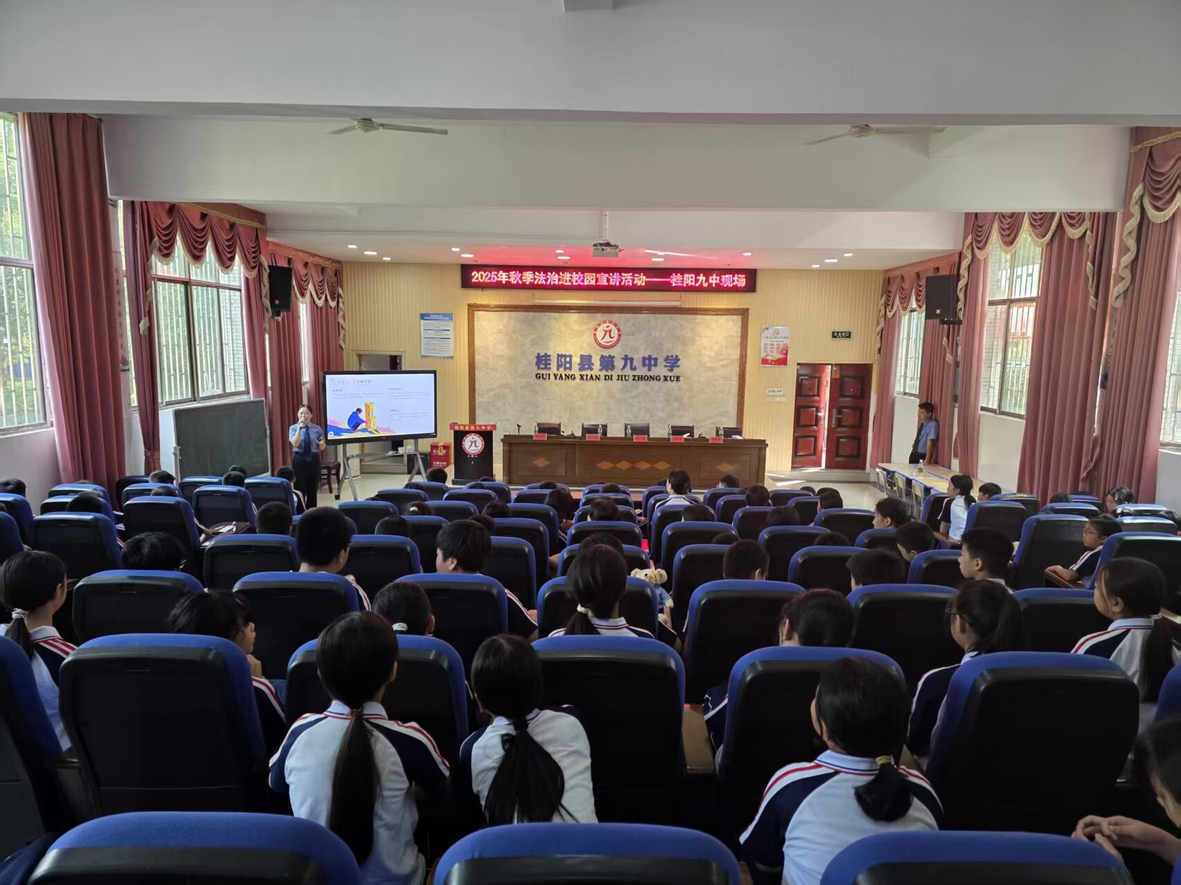 新桂阳9月12日讯(记者 李玮嘉)为进一步增强青少年法治意识,预防和减少校园违法犯罪,9月11日,县人民检察院到桂阳九中开展法治进校园宣讲活动。