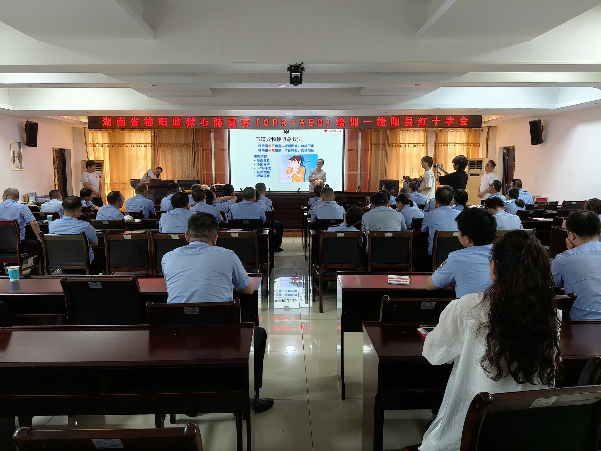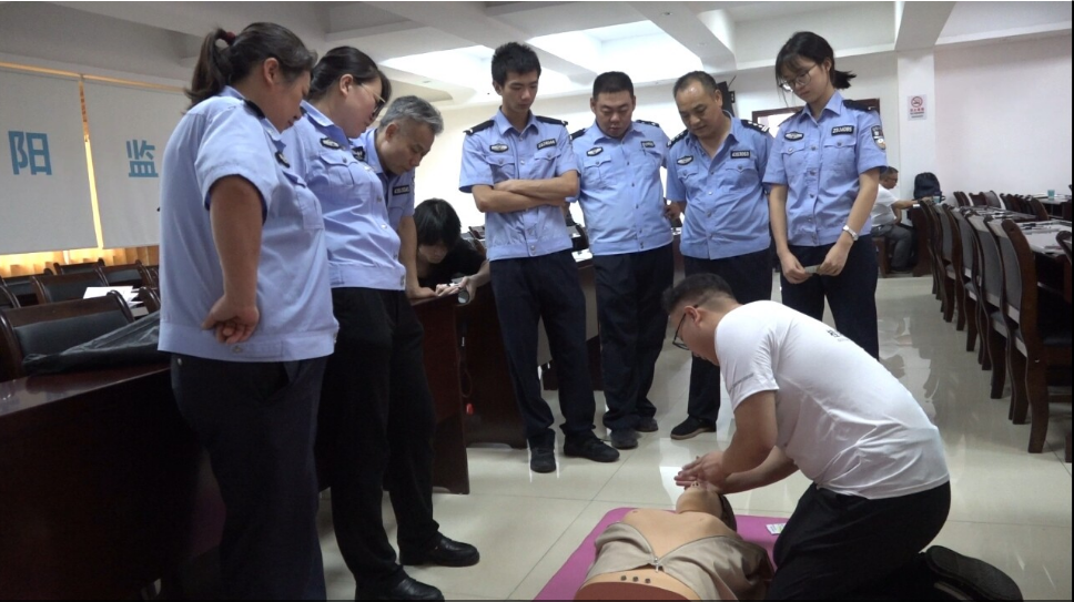 县红十字会救护师王金凤说:“红十字会精神,人道、博爱、奉献。今天来到桂阳监狱,为我们的干警们培训AED+心肺复苏的培训,以便于我们以后的干警在生活工作当中遇到突发事件的时候,用我们的一双手及一张嘴,就可以挽救一条生命。人人学急救,急救为人人。”