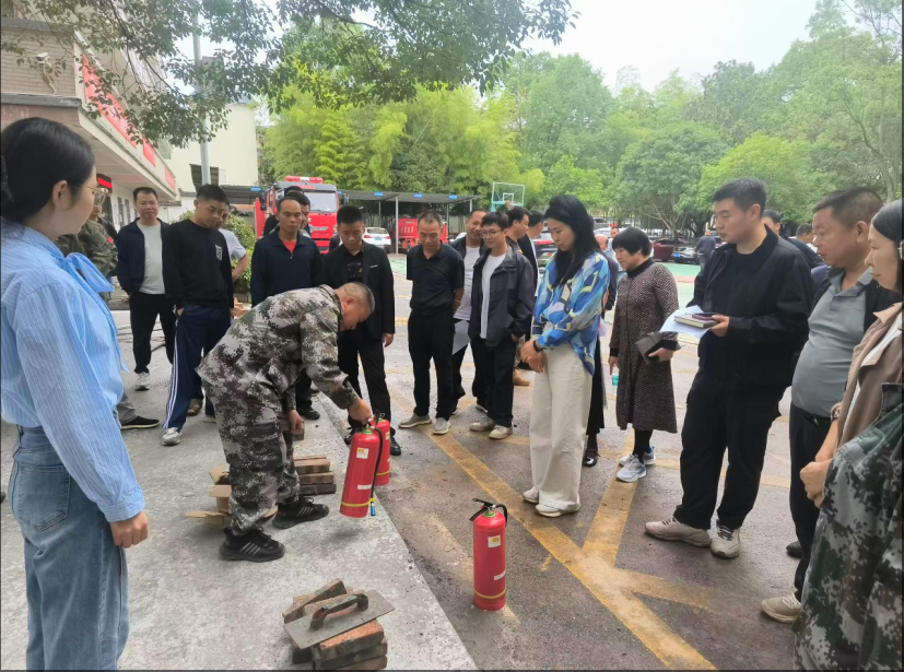 疏散演练后,消防器材实操培训随即展开。现场设置模拟火点,配备干粉灭火器、消火栓、高压水带等实战器材,镇消防专干进行现场教学。"使用灭火器时,需牢记'一提、二拔、三握、四压'——提住瓶身、拔掉保险销、握住喷管对准火焰根部、按压把手喷射……"专业人员详细讲解并示范了灭火器操作步骤、水带快速连接技巧及水枪精准喷射方法,强调"初期火灾扑救黄金3分钟"的处置要点。参训人员轮流上阵实操,在"手把手"指导下,逐一完成灭火器灭火、水带铺设、水枪喷射等全流程操作,亲身感受火焰扑灭瞬间的"实战感",切实提升了对消防器材的规范使用能力和初期火灾处置技能。