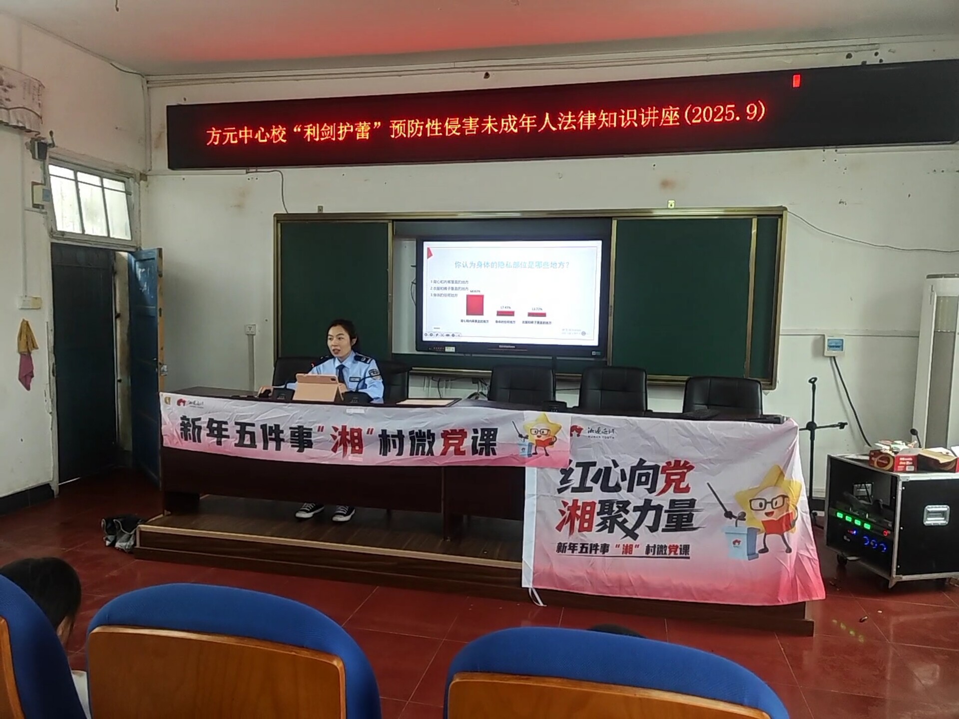 新桂阳9月26日讯(通讯员 邓雷)为切实加强未成年人法治宣传教育,提高其自我保护意识和能力,营造关心关爱未成年人健康成长的良好社会氛围,9月25日,方元镇司法所联合“桂阳星火”宣讲团,先后走进方元镇燕塘中心学校和方元中心学校,成功举办了以“普法进校园 以法伴成长”为主题的防性侵法治知识宣讲课堂。此次活动面向两所学校共计130余名学生,取得了积极反响。