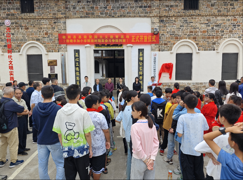 新桂阳10月16日讯( 通讯员 雷新龙 马国娇)2025年10月15日,桂阳县浩塘镇丰加小学爱国主义教育基地举行隆重的开放仪式。市、县相关领导、专家,湘南游击队第五支队后人代表,师生、村民代表等100余人参加了活动。这标志着桂阳县新增一处重要的红色文化教育阵地,为全县干部群众和青少年学习革命历史、传承红色基因提供了生动课堂。