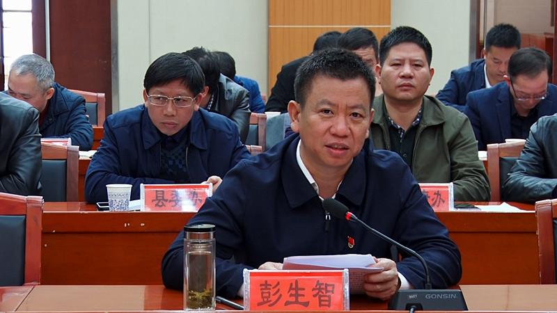 县委副书记黄力汇报全县2018年度脱贫攻坚工作情况,县领导陈潜、莫雄、周斌强等参加会议。
