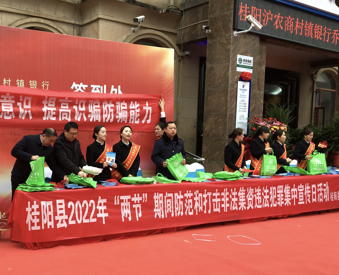 新桂阳1月26日讯(记者 陈英)1月25日,县处非办、县金融办组织公安局、市监局、人民银行桂阳支行、桂阳沪农商村镇银行在锦绣银湾开展2022年防范和打击非法集资违法犯罪集中宣传活动。