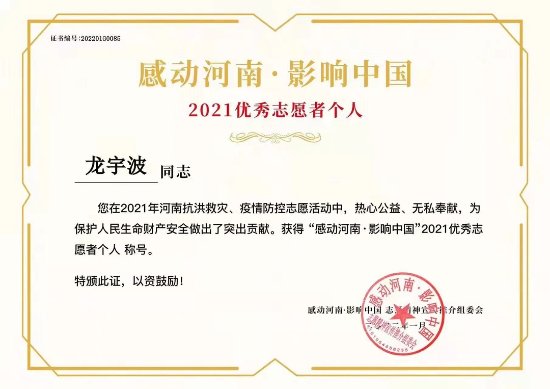 新桂阳2月16日讯(记者 黄磊 实习记者 彭嘉玲)近日,湖南省文明办下发通知,龙宇波被河南省精神文明建设指导委员会、中华志愿者联合会、河南省慈善总会等多部门联合授予2021.7.20河南省防汛救灾先进典型、2021年度“感动河南、影响中国”人物。