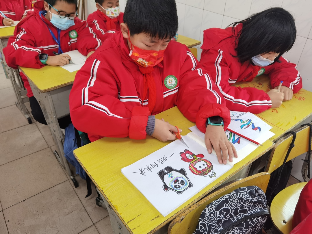 随后,同学们拿出提前准备好的绘画、剪纸工具,用笔、纸创作出自己心中的冬奥。一个个可爱的冰墩墩、雪容融跃然纸上,奥运五环、冬奥会会徽也纷纷浮现纸面。在展示环节,同学们都积极踊跃上台介绍作品,说出冬奥在自己心中独特的意义。