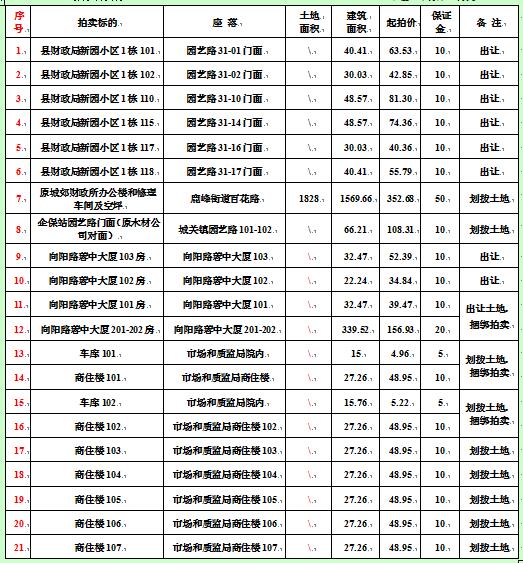 五、特别说明(瑕疵告知):①所有标的均以现状拍卖;②成交价为拍卖标的房地产价值(含土地出让金);③拍卖标的面积以有权部门核定为准;④办理不动产权证涉及买卖双方的所有税费按国家有关规定执行,没有规定的由均由买受人承担;⑤交纳50万元保证金的竞买人既可参加保证金为50万元标的的竞买,也可参加保证金为20万和任意三个保证金为10万元的标的竞买直至成交,交纳20万元保证金的竞买人既可参加保证金为20万元标的竞买,也可参加任意两个保证金为10万元标的的竞买,其余依此类推。