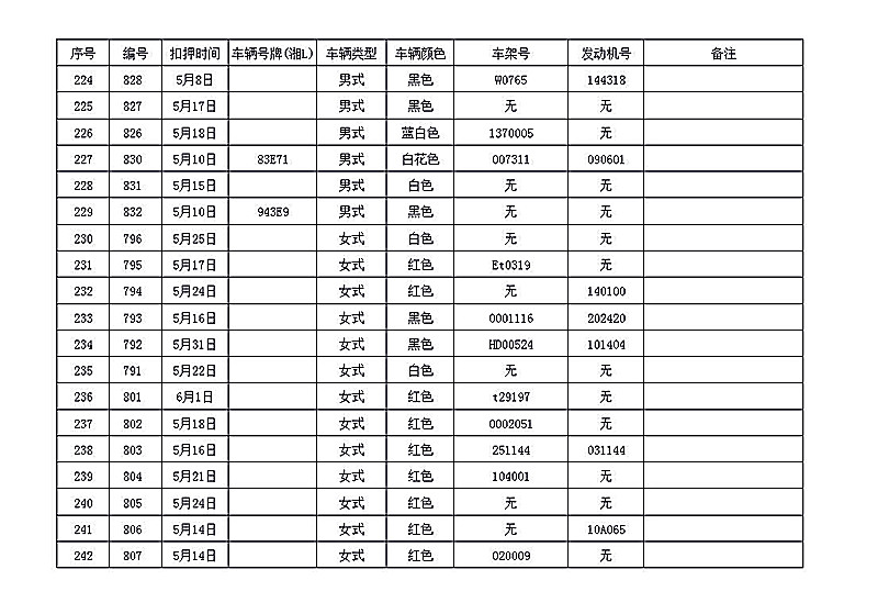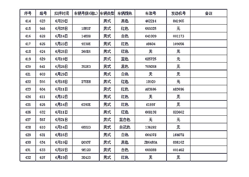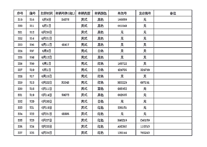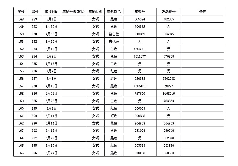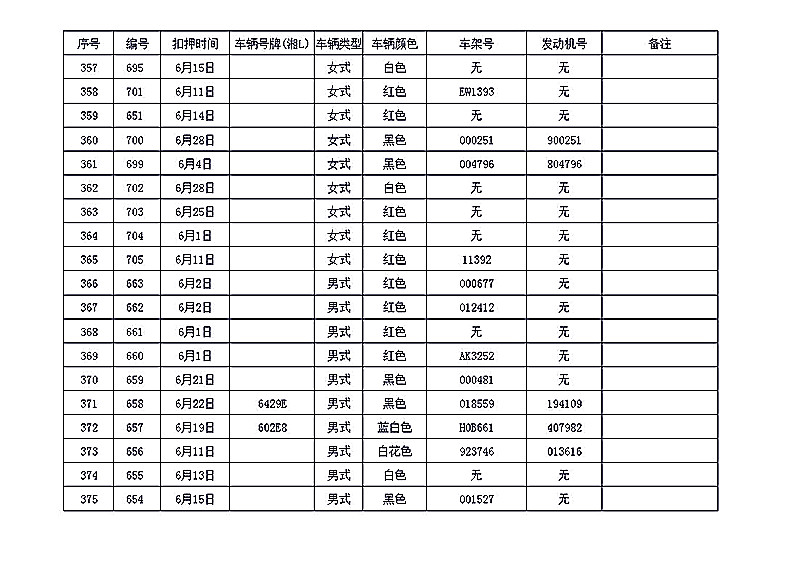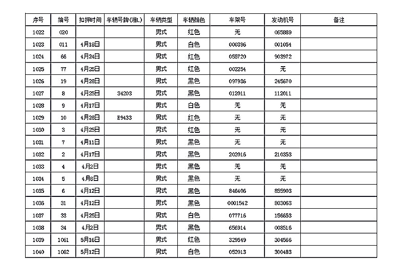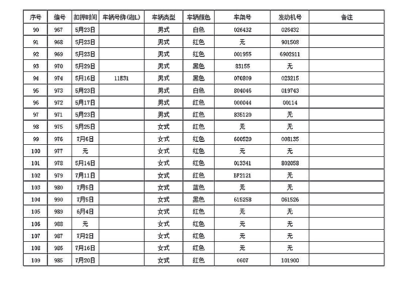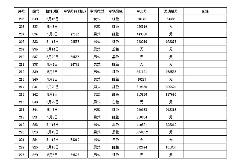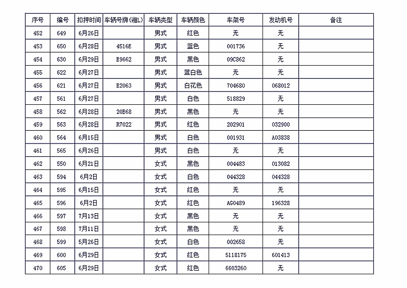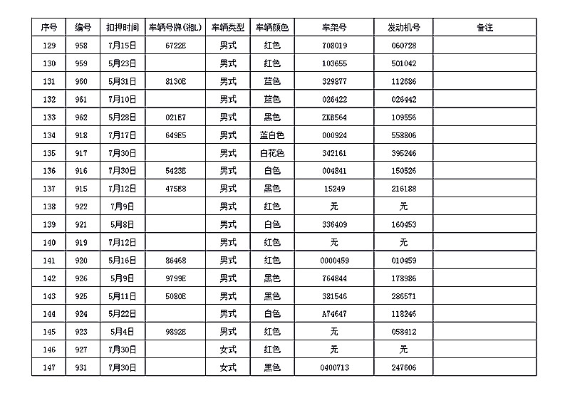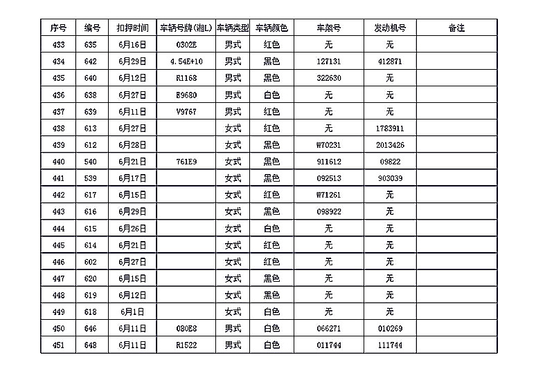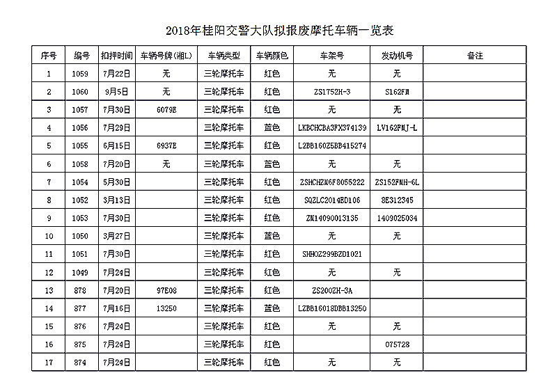 桂阳县公安局交警大队在交通执法中依法查扣了一批违法、违章车辆(详细资料见附表),现将这些车辆予以公告。请被公告车辆的车主或车辆所有人自公告之日起三个月内持身份证、行驶证等有效证件到桂阳县公安局交警大队进行处理,逾期不办理的,公安机关交通管理部门将根据《中华人民共和国道路交通安全法》和《机动车强制报废标准规定》的相关规定予以处置。