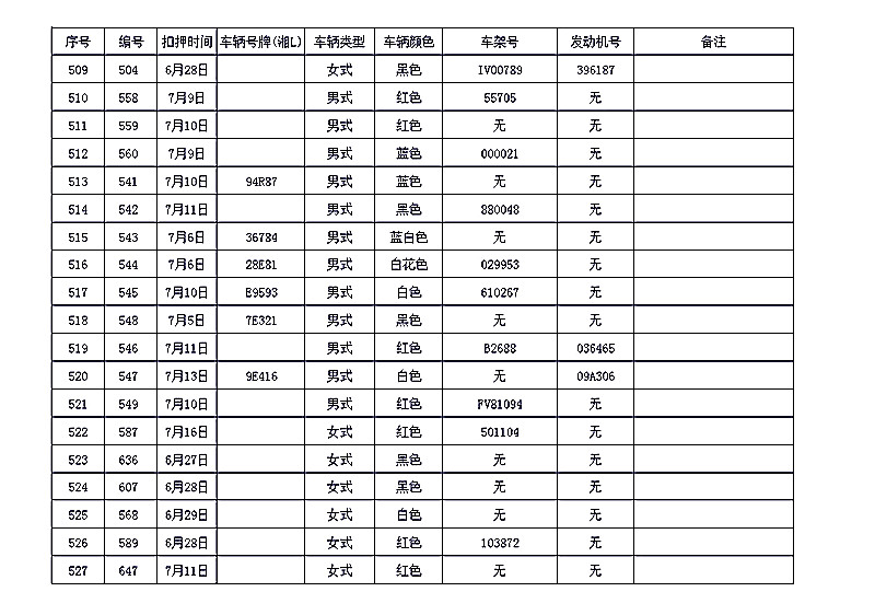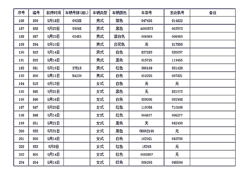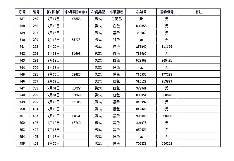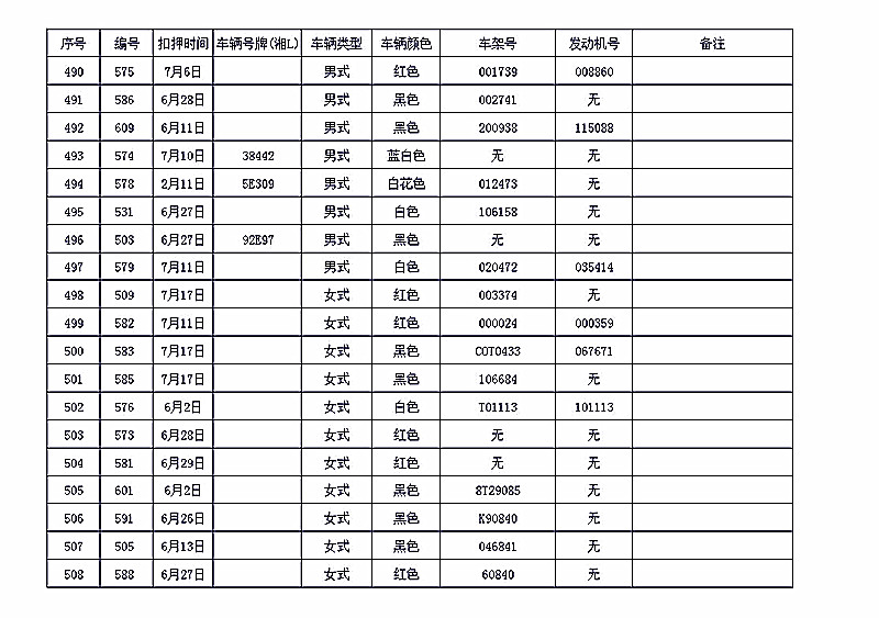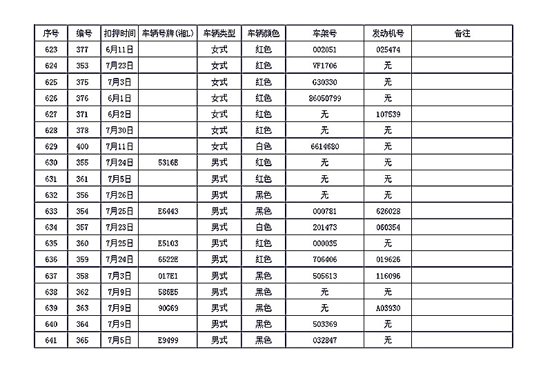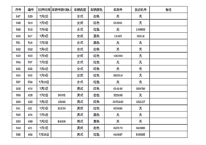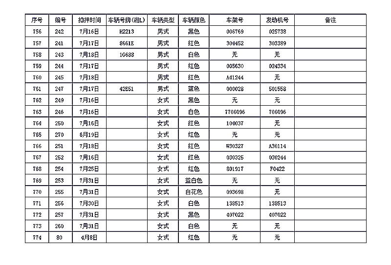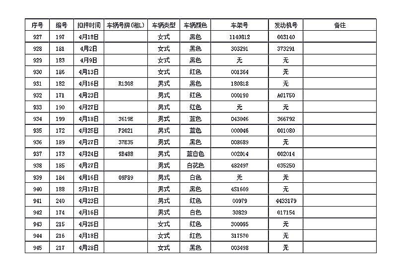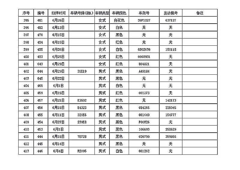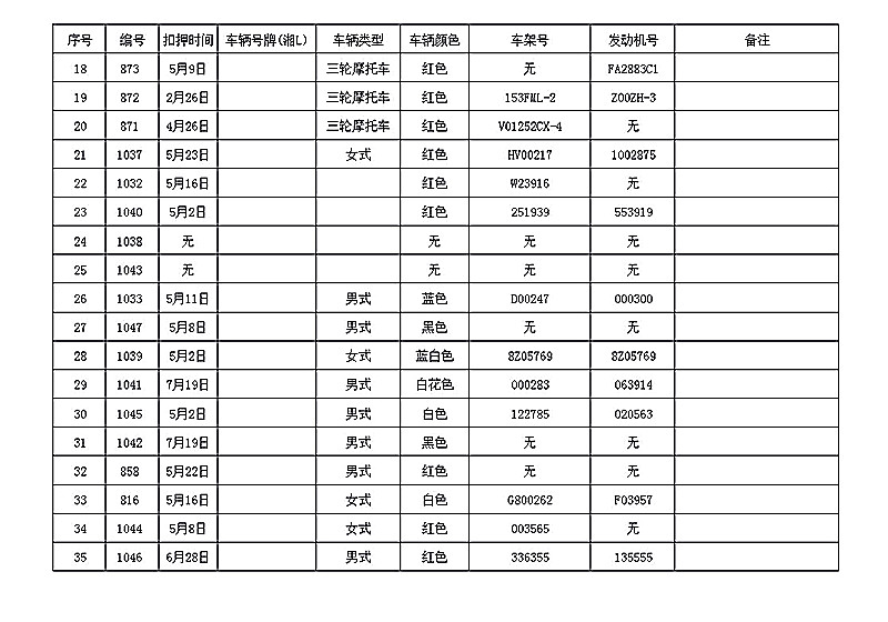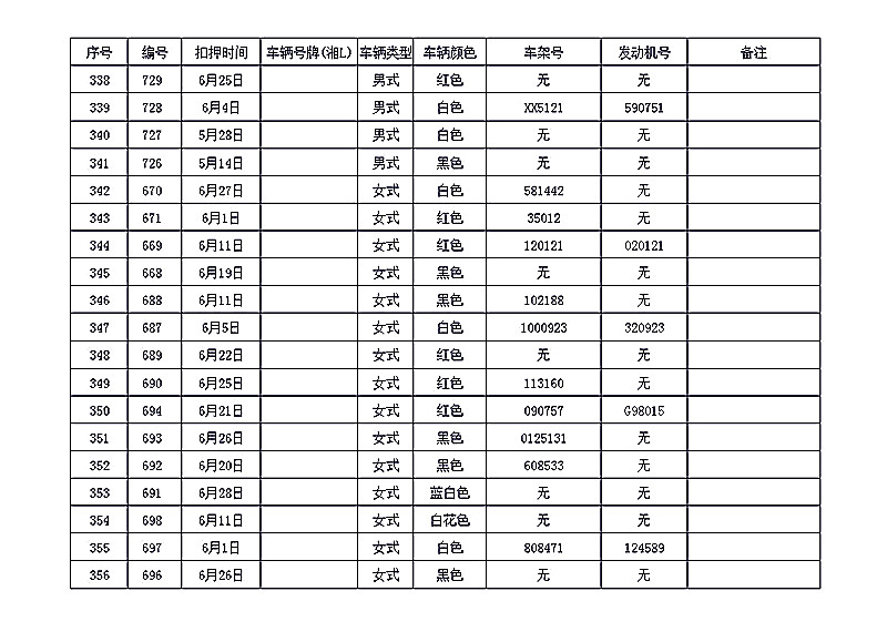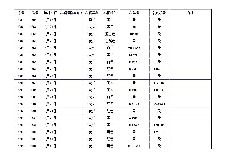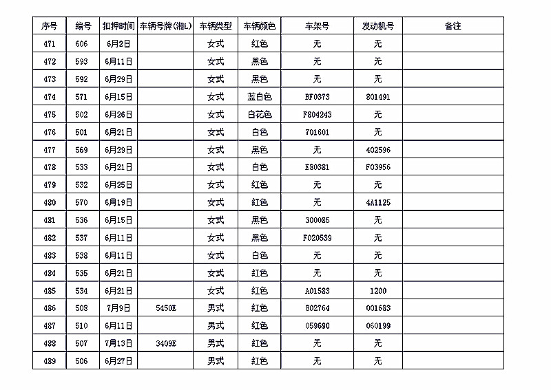桂阳县公安局交警大队在交通执法中依法查扣了一批违法、违章车辆(详细资料见附表),现将这些车辆予以公告。请被公告车辆的车主或车辆所有人自公告之日起三个月内持身份证、行驶证等有效证件到桂阳县公安局交警大队进行处理,逾期不办理的,公安机关交通管理部门将根据《中华人民共和国道路交通安全法》和《机动车强制报废标准规定》的相关规定予以处置。